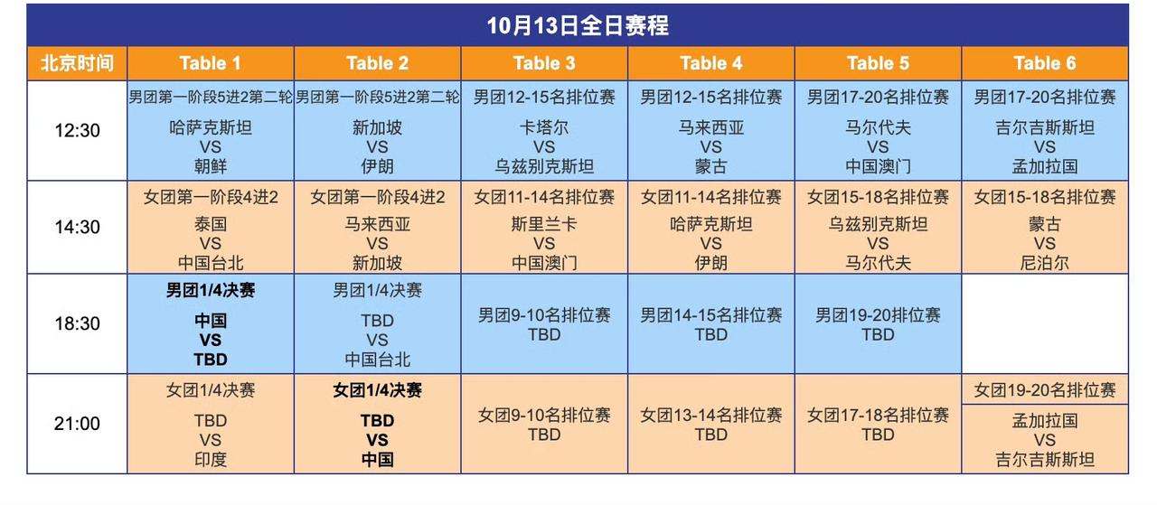 先睹为快[笑哭]! 国乒选手今日迎战[奋斗]! 今天(10月13日,周一)赛程来喽! 2025乒乓球印度亚锦赛10月13日全日赛程如图所示,国乒男团、女团都要进行1/4决赛。 其中,今晚六点半,一号台,🇨🇳中国男团对阵今天中午从小组赛里胜出的队伍! 今晚九点整,二号台,🇨🇳中国女团迎战从第一阶段小组赛里胜出的队伍。 国乒孩子们加油[奋斗]! (感谢草莓老师的图片)