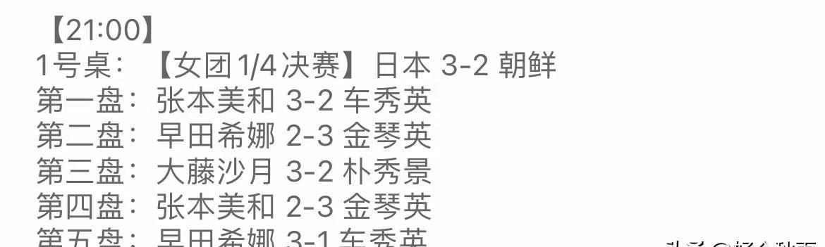 金琴英空砍两分,侯英超最后解说都有点迷糊了,日本女团与神秘之师朝鲜女团打了4小时,苦战24局,险胜晋级四强。 #秋日生活打卡记# 侯英超不得不感叹,朝鲜女团,虽败犹荣,战斗意志,值得点赞。 朝鲜女团与日本女团一战,历时四小时,激战24局,团体赛中破纪录了。 1、金琴英一人先后击败早田希娜和张本美和,两胜后却没人能凑上一分。 2、张本美和没能在第四盘拿下金琴英,压力扔给早田希娜,还好早田希娜3:1击败车秀英,完成自我救赎。 3、大藤沙月再次化身大藤遮月,头部遮挡被罚分,而朴秀景被罚两分,两人互相靠发球拿分,遮得天昏地暗。 咪咕视频的主持人周泽昊与侯英超打趣说:这场比赛播的,侯老师眼睛都要睁不开了。 侯英超说:朝鲜女团真的不错,意志力强,就是不常出来比赛,大家明天还要上班早起,接送孩子,谁知这场球打到这样。超长时间的比赛,破纪录了。 条友们,日本女团还得是国乒女团来打她们。
