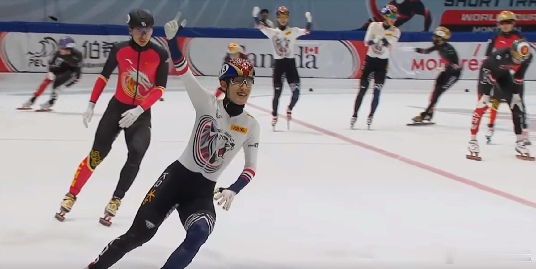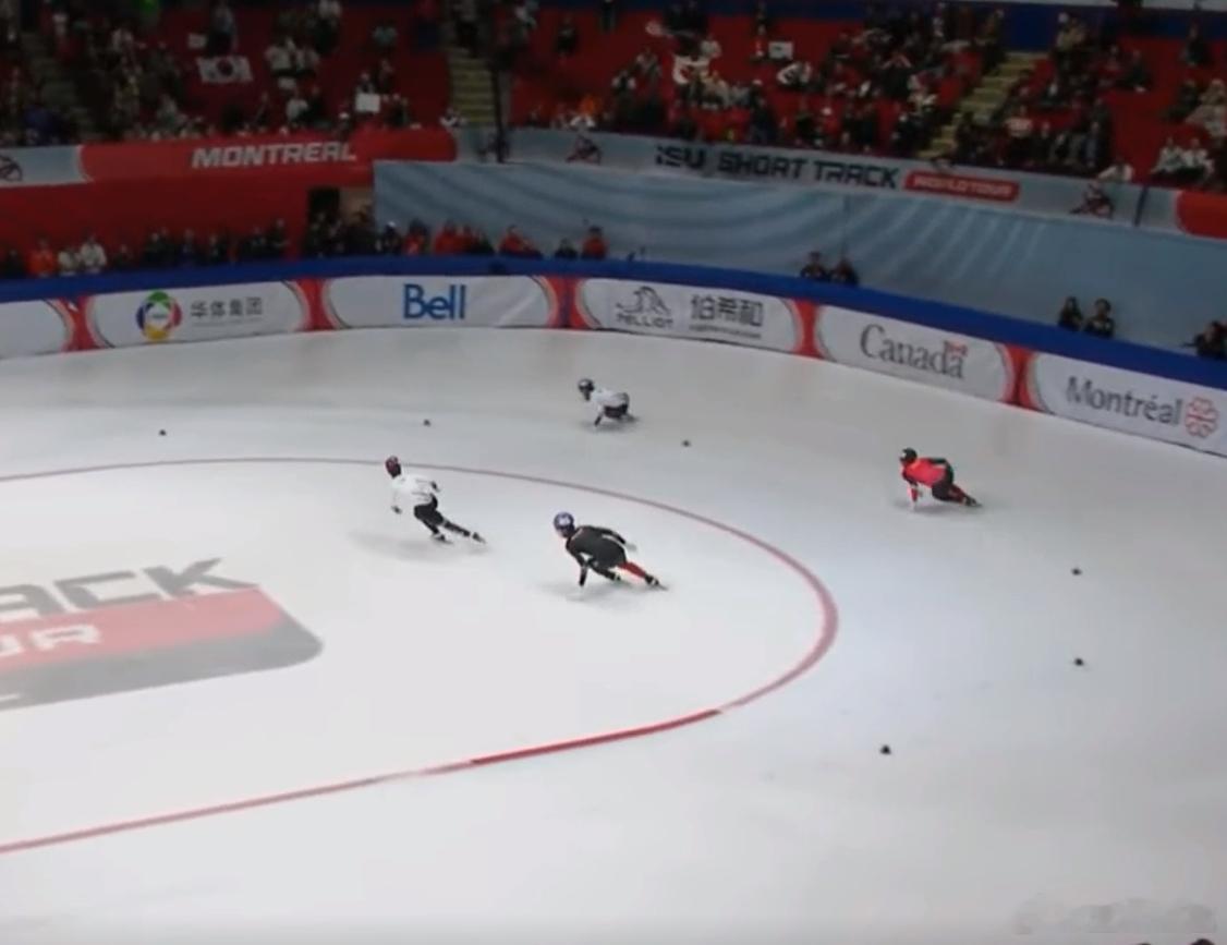 韩国队此时已经优势明显,加拿大队则在玩命追赶中国队。比赛还剩倒数两圈半,加拿大队头号王牌丹吉努失误摔出!场上进入中韩争金大战模式。