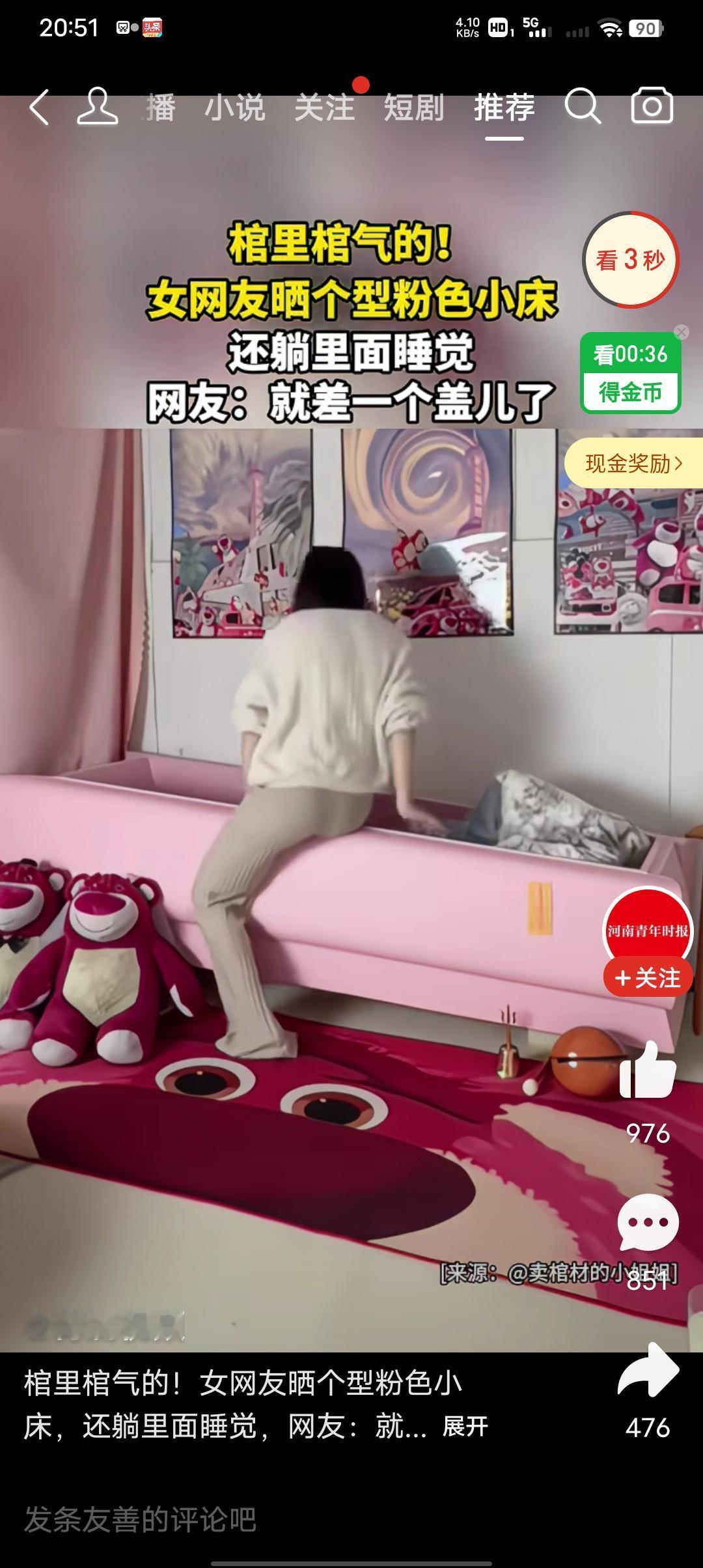 看看现在女孩的奇葩床,有网友说棺里棺气的,就差一个盖了,真盖了一辈子也就完了,有人在下面解释,那叫盖棺定论,你懂啥。还有个网友说,死了睡那么挤的床,活着咋就不能睡的宽敞一点呢!还有人说,床头还差个自拍照,再放一个供桌插上两短一长就更像了。 真的是现在的年轻人我们都看不通了,你永远都不知道他们在想啥,你以为好的在他们眼里会是想不通的存在,人家年轻人看上的,我们这些老古董会看的一愣一愣的。有人说,这样也好,等真走了,还睡不到呢,现在提前过过瘾吧! 审美不在一个频道,心思也不在一个界面,这就是代沟吧!