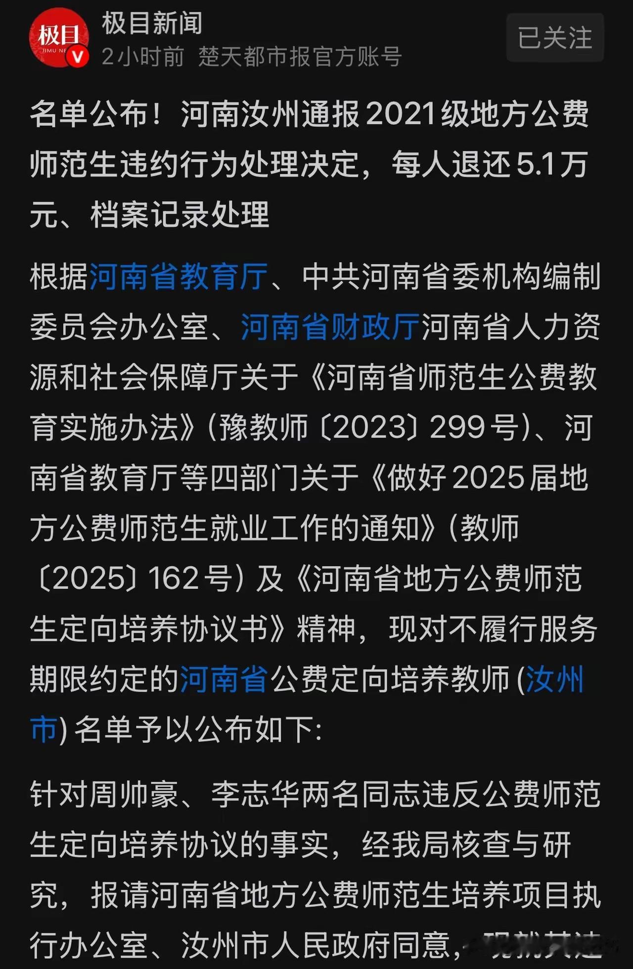 河南汝州市教育体育局通报,2021级地方公费师范生周帅豪、李志华因未履行定向培养协议(需在汝州基层学校服务6年),被认定违约。根据《河南省师范生公费教育实施办法》,两人需各退还培养补助及违约金5.1万元,并被记入个人人事档案及专项违约台账。 官方明确警示:公费师范生须坚守基层教育承诺,违约将面临经济与诚信双重惩戒。 国家花钱供公费师范生读书,条件是毕业后得在农村学校教6年。 这俩学生没做到,就得赔钱5.1万,还被记进诚信档案。 为啥这么严?因为国家资源不能白占,你签了协议就得说话算数,不然对其他愿意去农村教书的人不公平。 学生违约也可能是农村学校条件太差,工资不高、发展机会少。光靠罚款不行,还得给农村老师涨工资、分房子、评职称时照顾点,让他们愿意留下来。 现在把违约者名字公开,看着有点狠,但协议里提前说了会公开,而且这么做也是给以后的学生提个醒,别把公费师范当“跳板”,违约后果很严重。 其实惩罚不是目的,关键是让政策更有人情味。 比如允许教满几年后调岗,或者特殊情况少赔点钱。 毕竟只有让老师在农村待得舒心,这政策才能真正帮到乡村教育,不然光靠硬罚,问题还是解决不了。 大家怎么看?