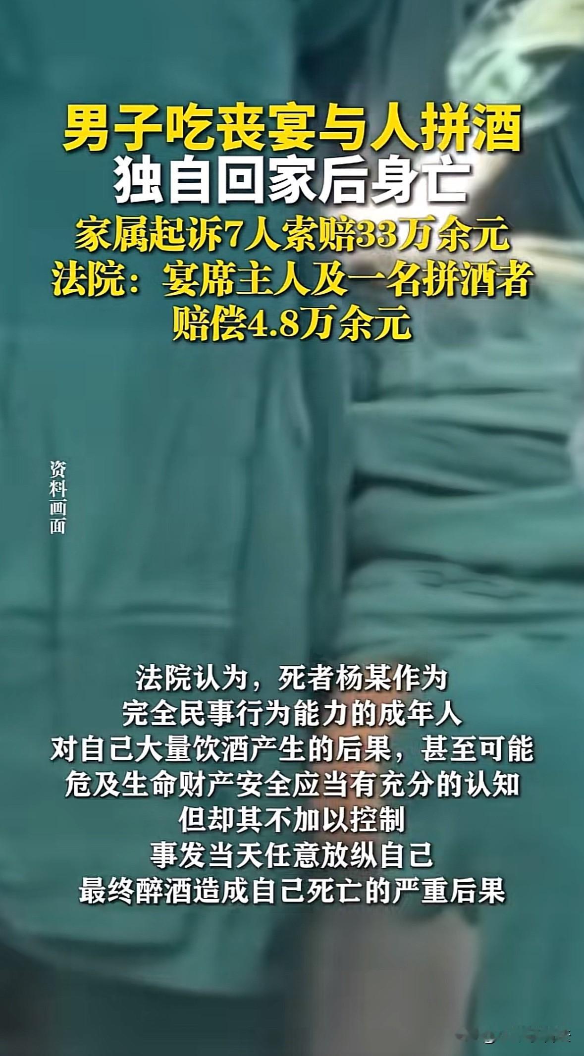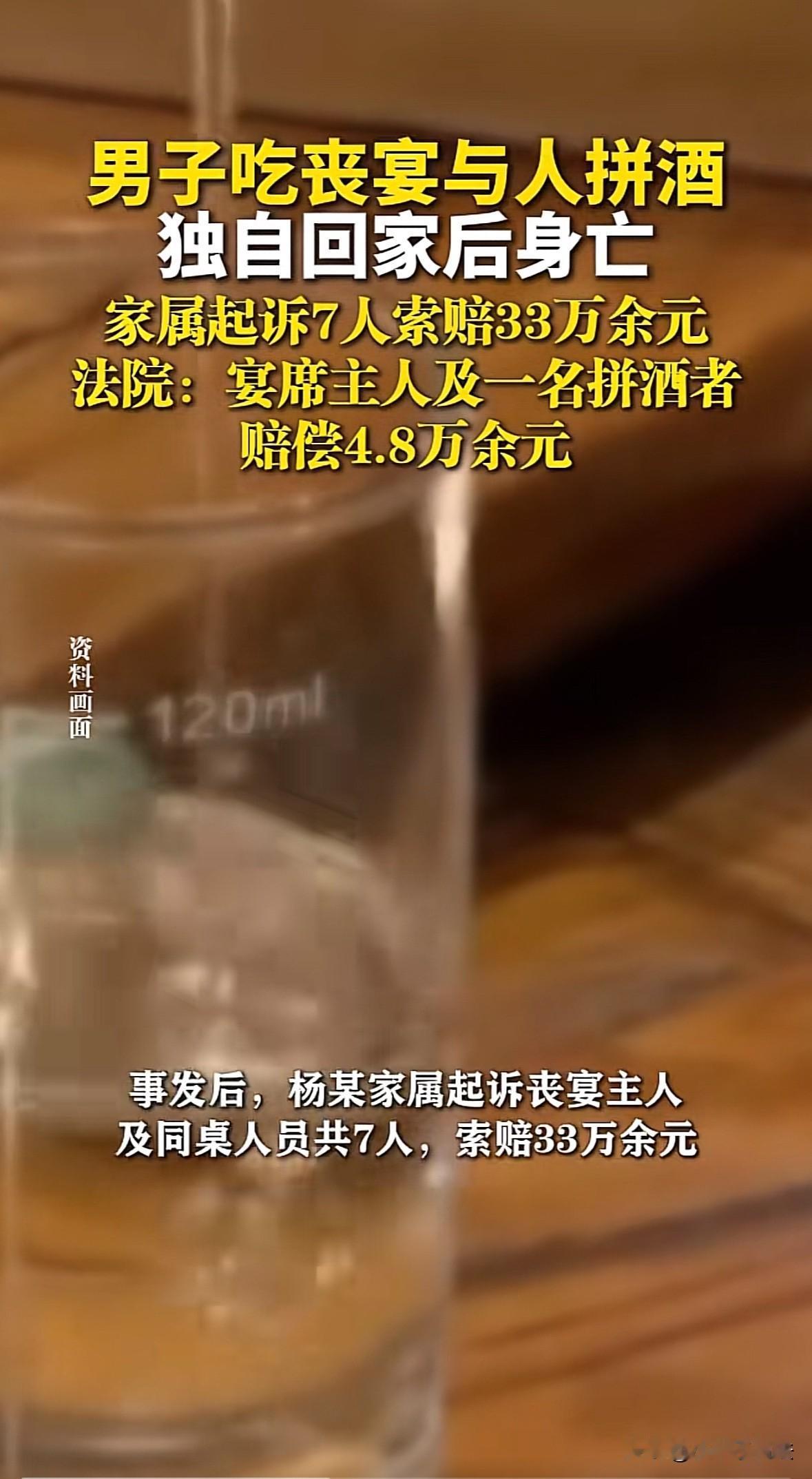 云南鹤庆,男子到朋友家吃丧宴,席间与朋友家属拼酒并发生言语冲突,而后男子独自回家。次日男子被发现身体僵硬躺在大门内水缸旁,家属报警。经检测,男子血液中乙醇含量793.06mg/100ml,达致死量,但家属拒绝尸检。家属认为男子是在丧宴上喝的酒,举办丧宴主家以及同桌吃饭5人都应负有赔偿责任,起诉索赔33万,法院这样判决。 在2025年5月6日,杨某的家人从外面回到家,一进家门就看到杨某躺在大门内的水缸旁,怎么叫都没有反应。 家人上前去准备叫醒杨某,岂料杨某已经身体僵硬,没有了呼吸。家人并不知道发生了什么事情,于是立即报警。 警方赶到杨某家后,对杨某的体征做了检查,杨某四肢僵硬,已无生命体征,疑似酒后死亡,排除他杀的可能性。 因杨某家人在5月5日都外出不在家,所以对于杨某到底是跟谁喝了酒,怎么导致的酒后死亡并不知晓。 想要知道杨某的死因,就要对尸体解剖检验,但是家属是拒绝解剖的,只能根据现有数据出具尸体检验鉴定书。 鉴定书分析说明:杨某衣着完整,体表无损伤痕迹,可以排除因机械损伤导致的死亡。 杨某血液中乙醇含量793.06mg/100ml,根据资料记载,已达致死量。 家属通过杨某的手机以及询问街坊四邻得知,杨某在5月5日晚上曾前往母某甲家参加丧宴。 母某甲的母亲过世,母某甲在家中设宴,宴请杨某前来赴宴。因家中没有其他人,杨某就去母某甲家参加了晚上的丧宴。 母某甲准备的丧宴是自助餐,饭菜自选,酒水自便。杨某选好饭菜后,就开始喝酒。 跟杨某同桌的一共有5个人,其中一个是母某甲的家人母某乙。杨某在饭桌上跟母某乙拼酒,两个人越喝越凶,还爆发了言语冲突。 据在场的人描述,杨某在爆发语言冲突后就独自离开回家了,再往后的事就不得而知了。 杨某的家属串联起全部的情况,足以证明杨某的酒是在母某甲家喝的,而且母某乙还跟杨某拼酒并争吵了起来。 在杨某独自回家的时候,母某甲也没护送杨某回家,导致杨某到家后就躺在大门内的水缸旁无人照料,以此导致杨某死亡。 杨某家属认为母某甲和母某乙对杨某的死亡负有直接责任,同桌的其他5人肯定也跟杨某喝过酒,也没有人送杨某回家,是杨某死亡的主要原因。 因此杨某家属起诉,要母某甲和母某乙以及同桌吃饭的5个人赔偿33万元。 根据《民法典》第1179条的规定:侵害他人造成人身损害的,应当赔偿医疗费、护理费、交通费、营养费、住院伙食补助费等为治疗和康复支出的合理费用,以及因误工减少的收入。造成残疾的,还应当赔偿辅助器具费和残疾赔偿金;造成死亡的,还应当赔偿丧葬费和死亡赔偿金。 杨某家属认定,杨某是在母某甲组织的丧宴上喝的酒,和杨某喝酒的人有拼酒的母某乙和其他同桌吃饭的5个人。 杨某的死因虽然不明确,但是血液内酒精含量已经达到致死量,可以认定杨某就是喝酒过量导致的。 所以杨某家属认为,丧宴的组织者母某甲和拼酒的母某乙,以及同桌吃饭的5个人都应对杨某的死负有过错赔偿责任。 母某甲作为丧宴的组织者,未对杨某尽到安全保障义务,让杨某独自一人回家,其存在过错。 母某乙在饭桌上和杨某拼酒,是导致杨某喝醉酒的主要原因,因此母某乙也存在过错。 饭桌上的其他5个人,无论是否对杨某有劝酒行为,但在看到杨某喝多离开饭桌时,没有人送杨某回家,也没有告知主家举办者,也存在过错。 因此杨某家属起诉索赔33万,由其7个人负责赔偿。 法院审理后认为: 根据《民法典》第1165条的规定:行为人因过错侵害他人民事权益造成损害的,应当承担侵权责任。 依照法律规定推定行为人有过错,其不能证明自己没有过错的,应当承担侵权责任。 杨某作为完全民事行为能力人,应对大量喝酒可能产生的后果有充分的认知。杨某也应在喝酒时谨慎注意,但杨某却跟人拼酒,导致酒后死亡,其自身存在重大过错。 母某乙也是成年人,也应该知道过度饮酒会导致的后果,却还跟杨某拼酒,是导致杨某喝醉酒的主要原因,所以母某乙存在过错。 母某甲作为丧宴的组织者,也是酒水的提供者。应当对饮酒的客人多加注意,尤其是在母某乙和杨某拼酒的时候,更应该进行劝阻。 在发现杨某独自离开时也应该让人陪同,直到把杨某安全的交给其家人,但是母某甲都没有做到,也存在过错。 杨某家属主张同桌其他5人承担赔偿责任,法院不予支持。 最终法院判定,杨某的死亡损失认定为96万元。因杨某的血液酒精含量过高,不排除杨某还与其他人喝过酒的可能性。 因此母某乙的责任承担比例酌定为3%,赔偿28910.61元。母某甲的责任承担比例酌定为2%,赔偿19273.74元,其余损失由杨某自行承担。
