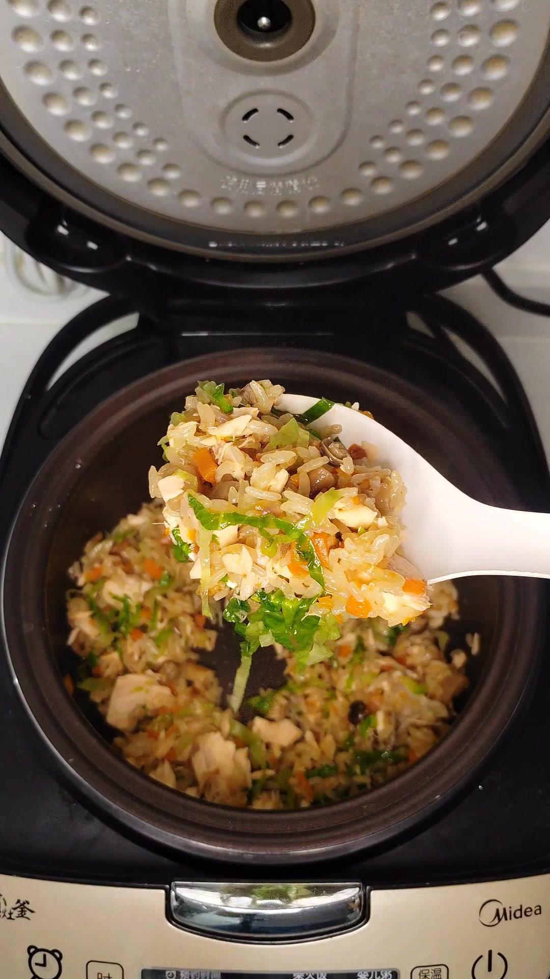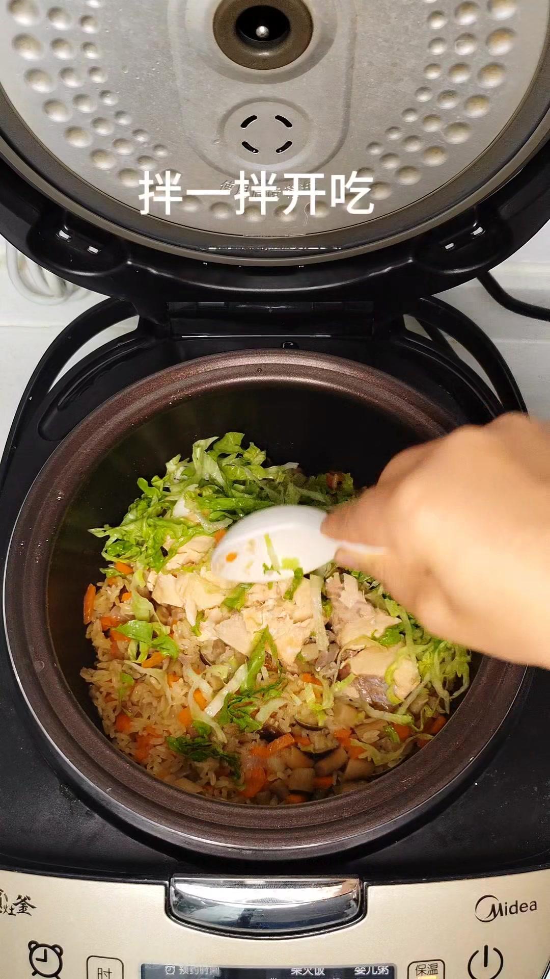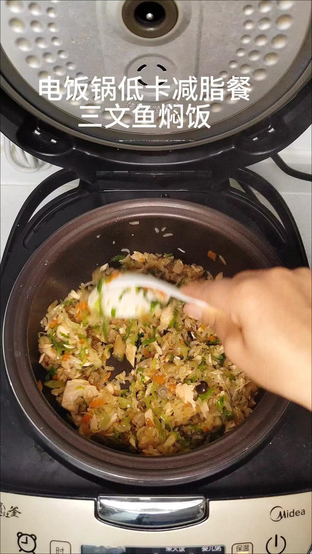 🍚电饭煲版三文鱼焖饭,低卡减脂还巨香!1️⃣备料:米淘洗干净,洋葱、胡萝卜、菌菇切小丁,三文鱼,青菜洗好备用。 2️⃣烹饪:三文鱼入锅煎熟,菜类(除青菜)放入电饭煲焖出香味,放入大米加盐、生抽,加半碗水,放入煎好的鱼按下煮饭键。煮好后放入青菜拌匀,就可以吃啦!