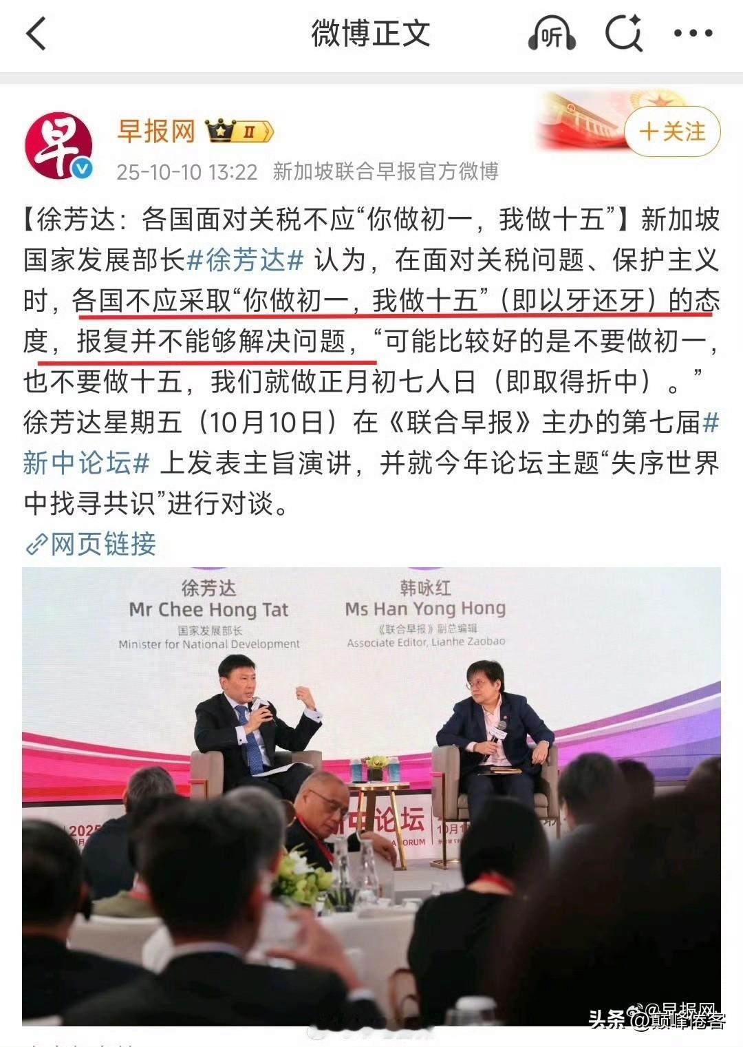新加坡国家发展部长徐芳达的意思是美国对华发动关税战,中国就应该马上像新加坡一样屈服跪下,不应该反制美国? 这是新中论坛,新加坡几个意思? 新加坡这个弹丸小国,永远不理解,正是因为有中国这样的负责任世界大国在前边顶着美国的反世界性关税战,所以他们这些小国家才有机会和美国谈判,最终取得一个“折中”! 新加坡最大的问题是摆不正自己的位置,作为美国的仆从国,天生就对勇于反抗美国的中国充斥着不满!嘴上说自己中立客观,实则屁股歪的简直就差直戳戳攻击中国胆敢反制它的美国主子了?