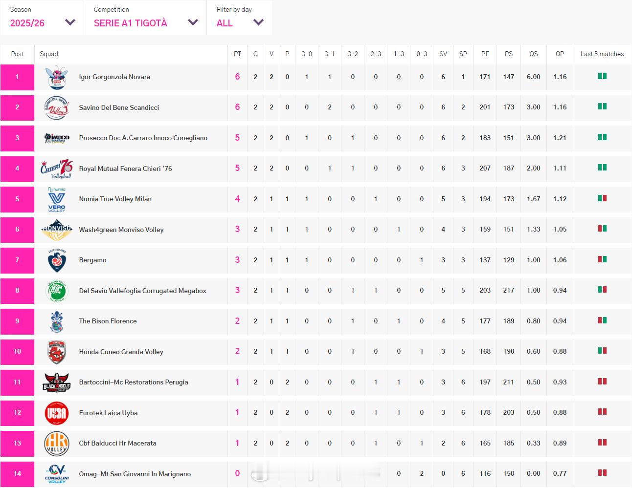 【意甲女排最新积分榜】国际排坛战报速递 10月12日,意甲女排第二轮结束,诺瓦拉和斯坎迪奇两战全胜全取6分排名前二,科内利亚诺和基耶里2胜5分暂列三四位,米兰1胜1负4分排名第五。两轮之后,只有圣乔瓦尼尼没有积分入帐零分垫底。