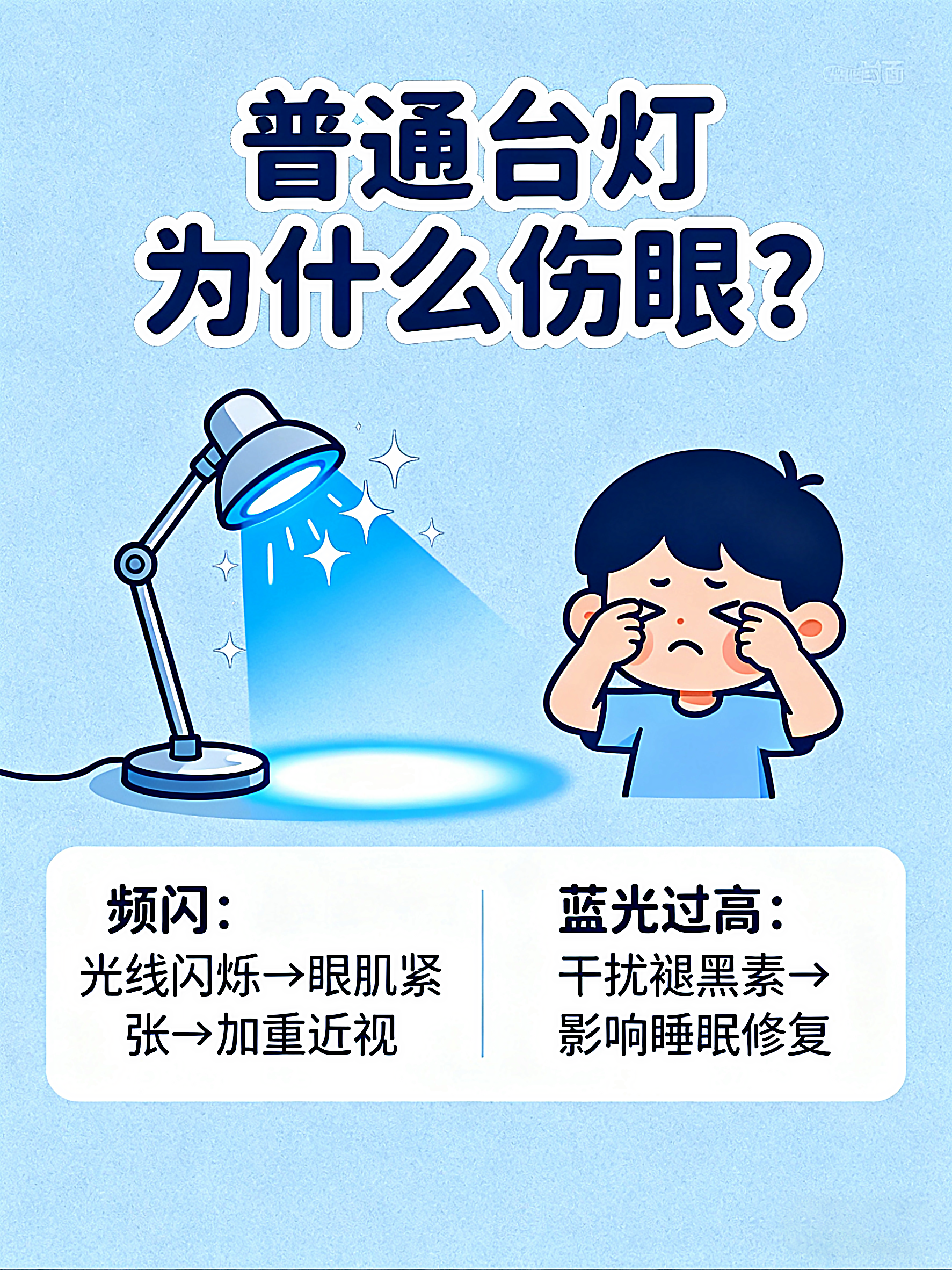 为什么普通台灯会伤眼?简单说,不良光线会导致视疲劳和干眼症。比如,频闪(光线快速闪烁)会让眼部肌肉紧张,长期可能加重近视;而蓝光过高则会干扰褪黑素分泌,影响睡眠和眼睛修复。