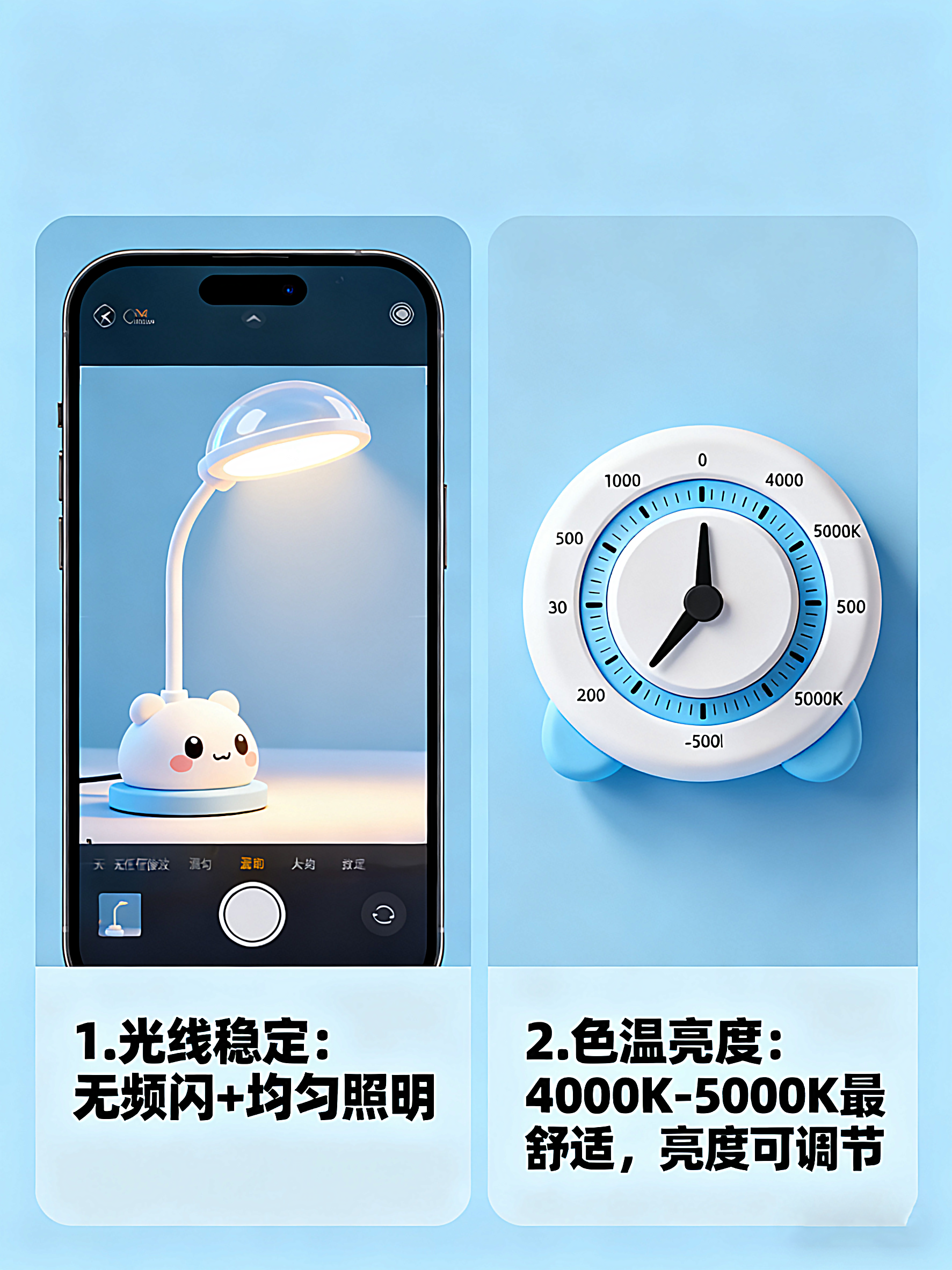 1.看光线稳定性:选无频闪和均匀照明 频闪是眼睛疲劳的元凶之一。好的护眼台灯应该通过高频调光或无频闪技术,让光线稳定不闪烁。测试方法很简单:用手机摄像头对准灯光,如果屏幕没有波纹,就基本合格。均匀照明能减少阴影,避免眼睛反复调节焦点,保护视力。