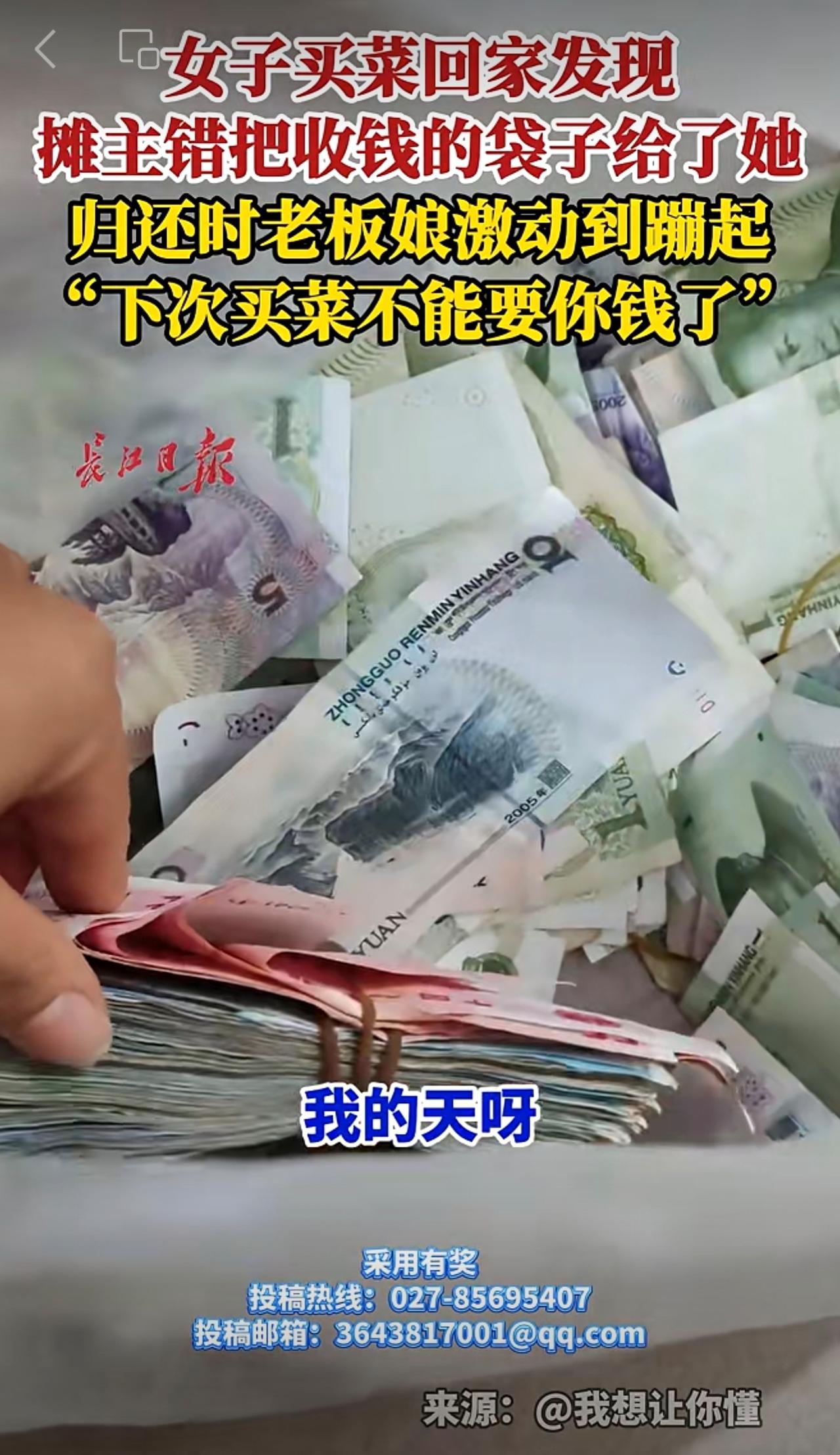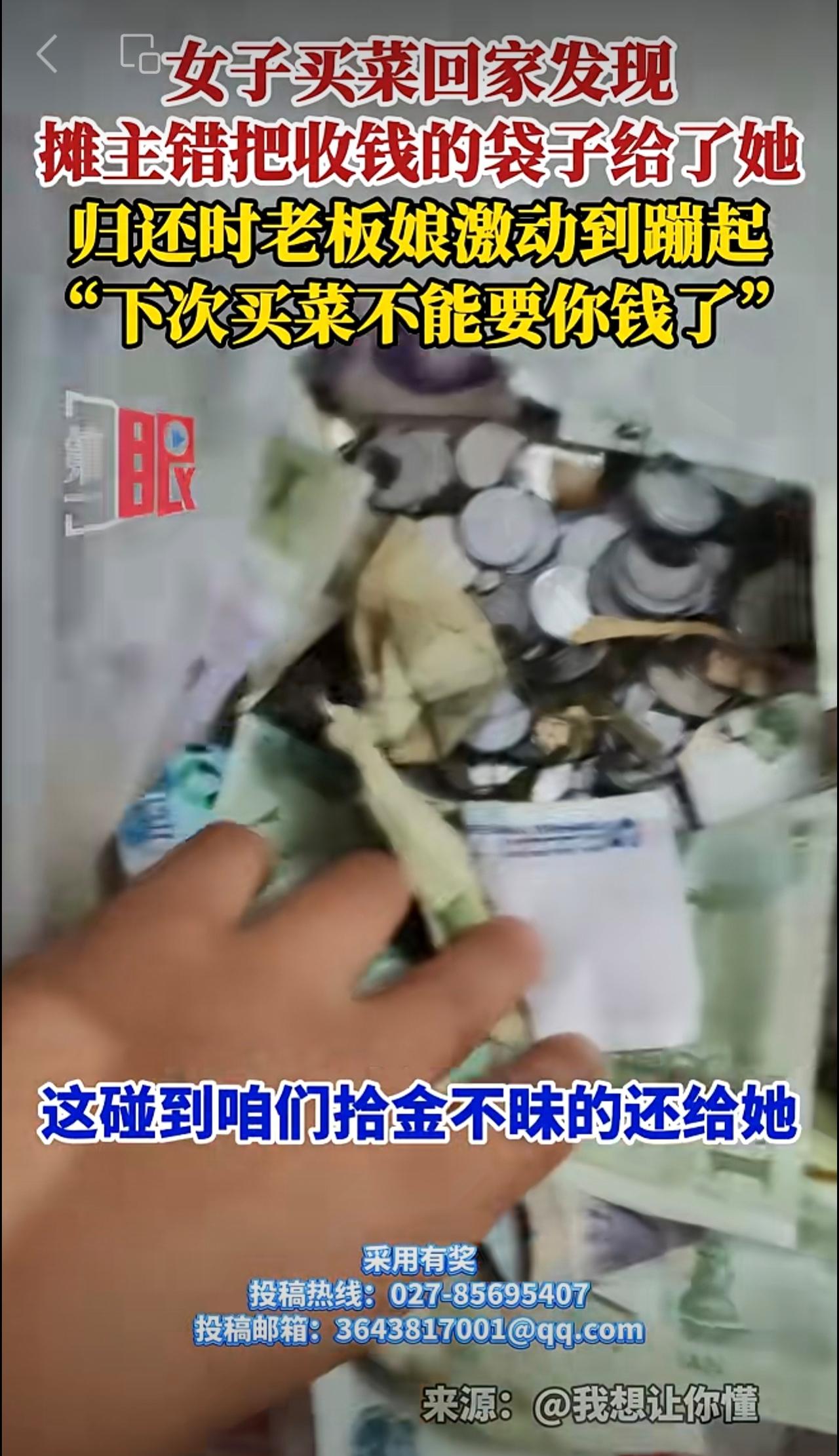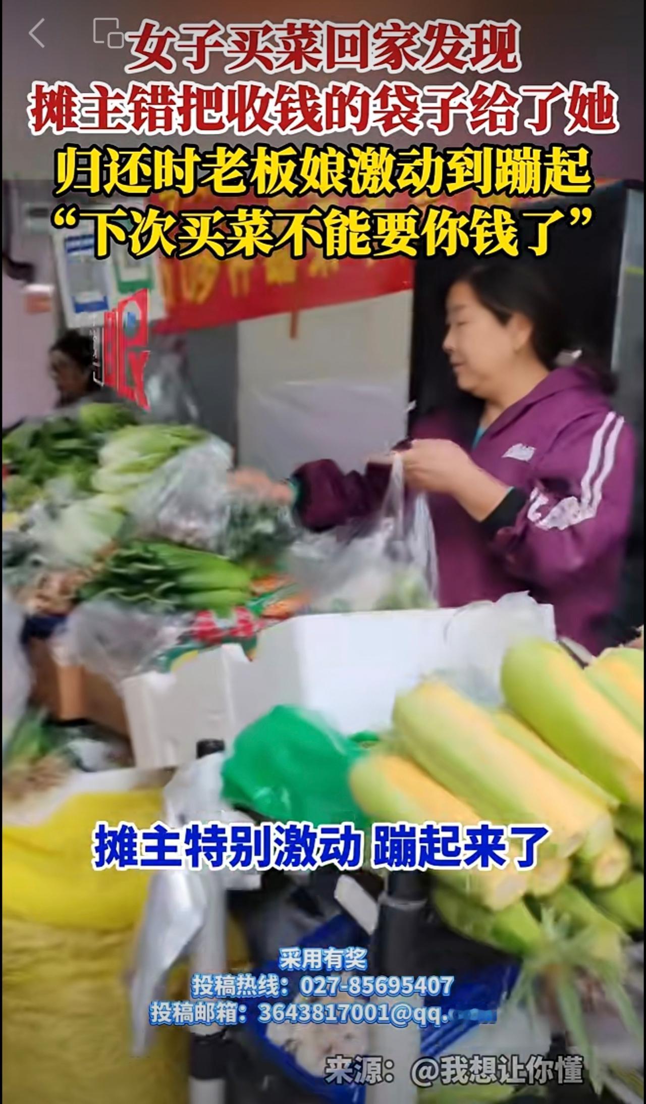 女子买菜回家发现,摊主错把收钱的袋子给了她,归还时老板娘激动到蹦起:“下次买菜不