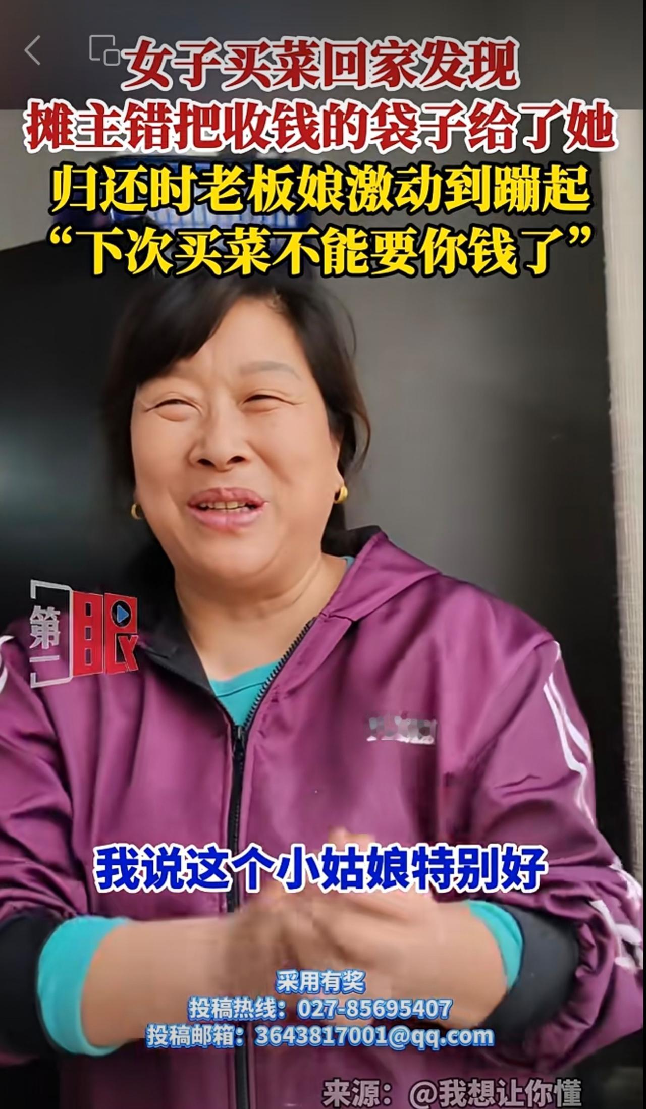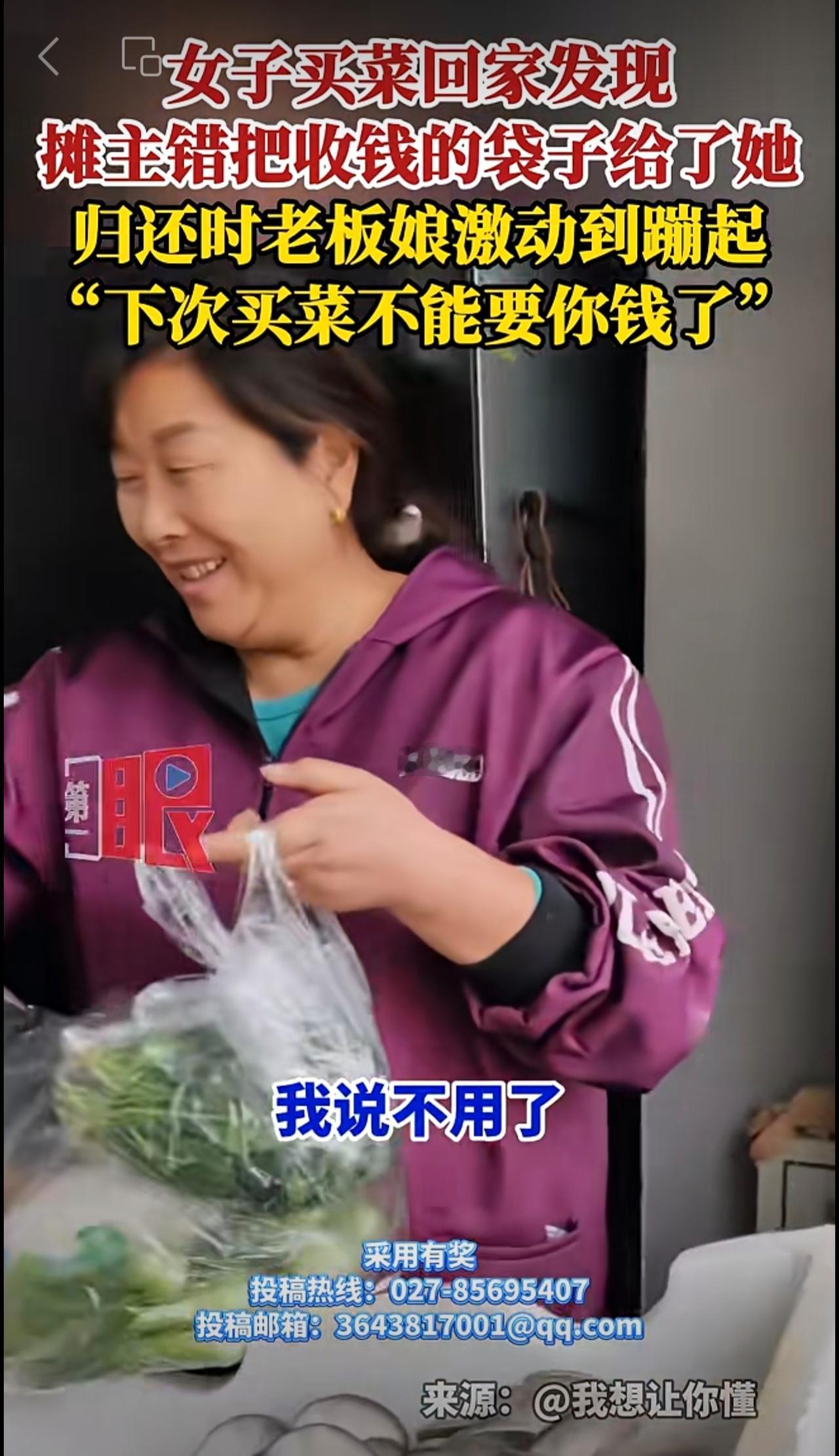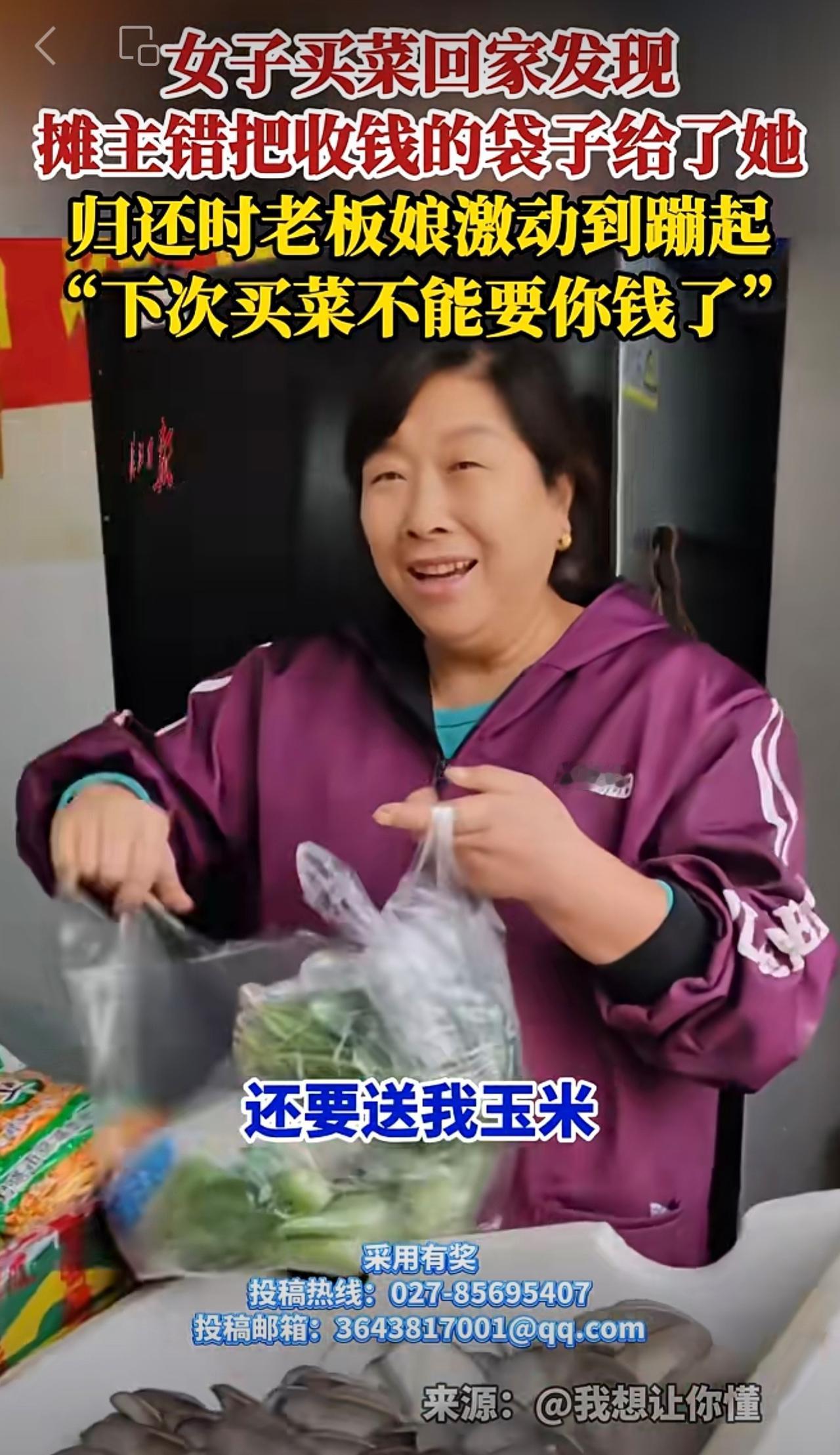 女子买菜回家发现,摊主错把收钱的袋子给了她,归还时老板娘激动到蹦起:“下次买菜不能要你钱了”