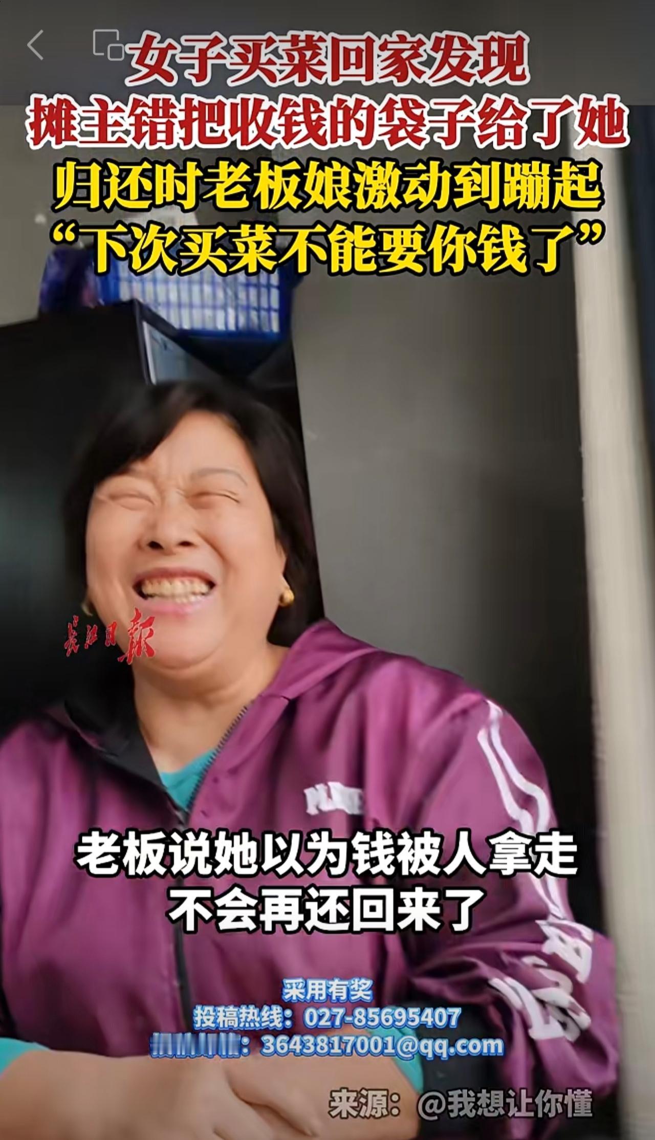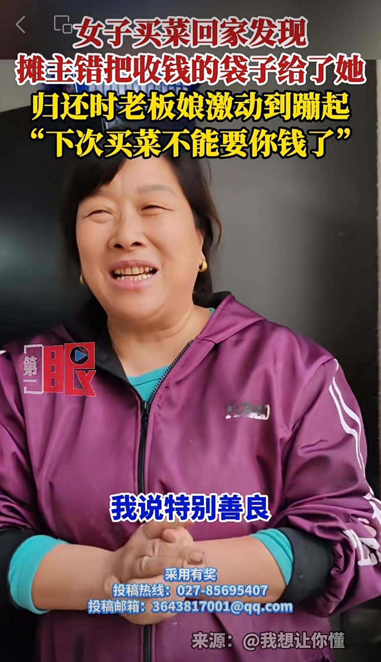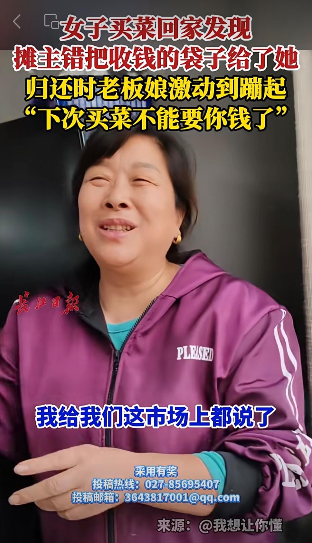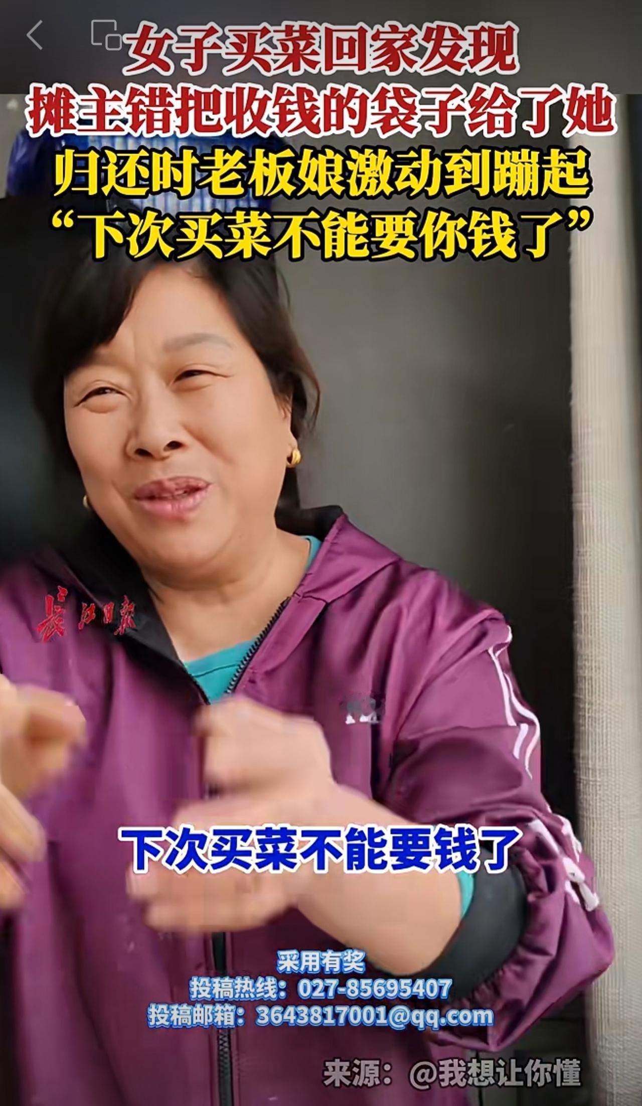 女子买菜回家发现,摊主错把收钱的袋子给了她,归还时老板娘激动到蹦起:“下次买菜不能要你钱了”