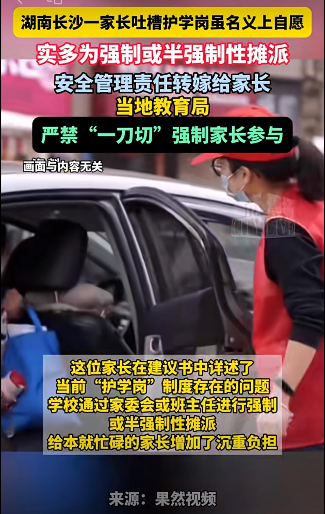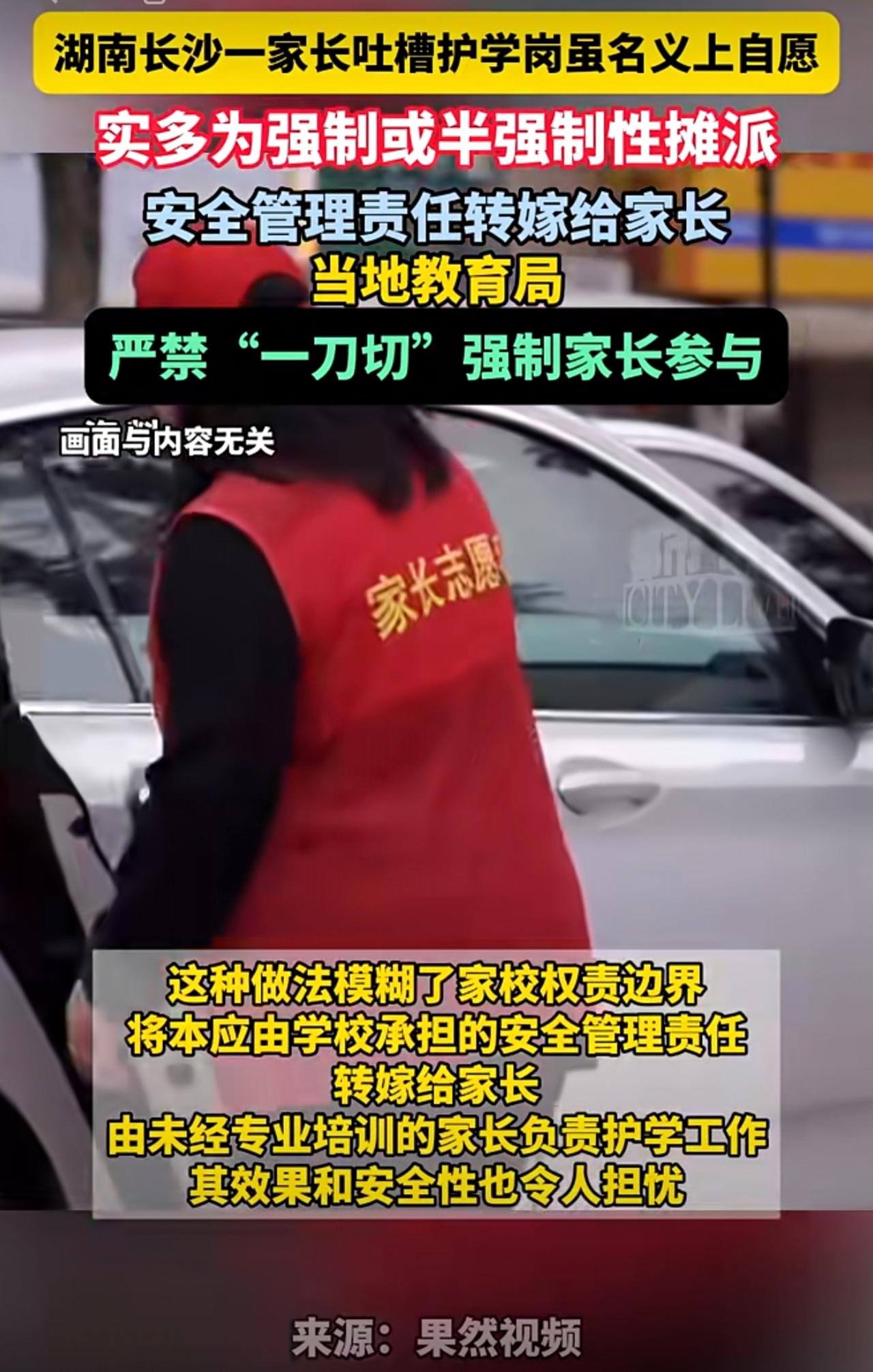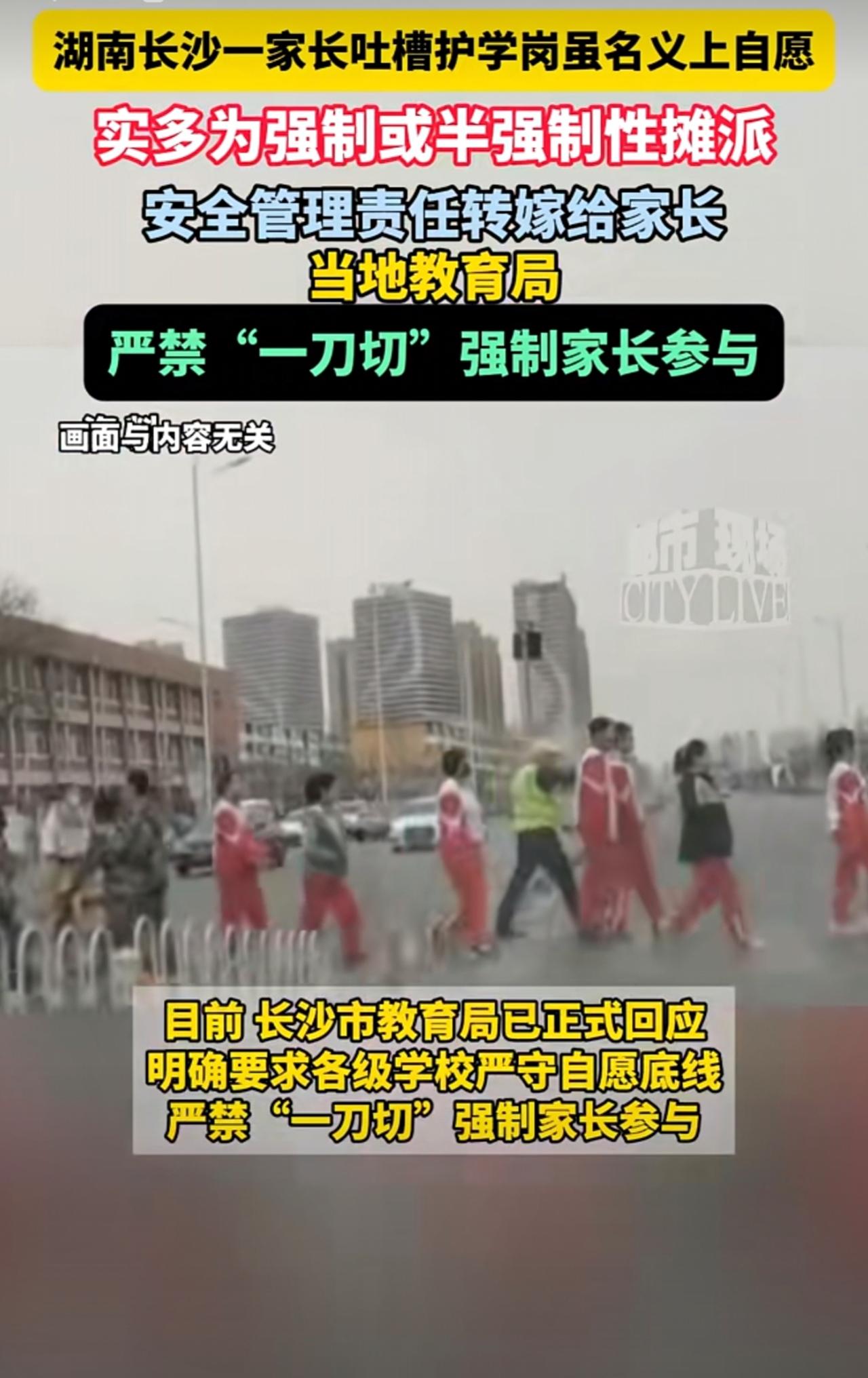 湖南长沙一家长吐槽护学岗虽名义上自愿,实多为强制或半强制性摊派,模糊了家校权责边界 将本应由学校承担的,安全管理责任转嫁给家长,当地教育局:严禁“一刀切”强制家长参与