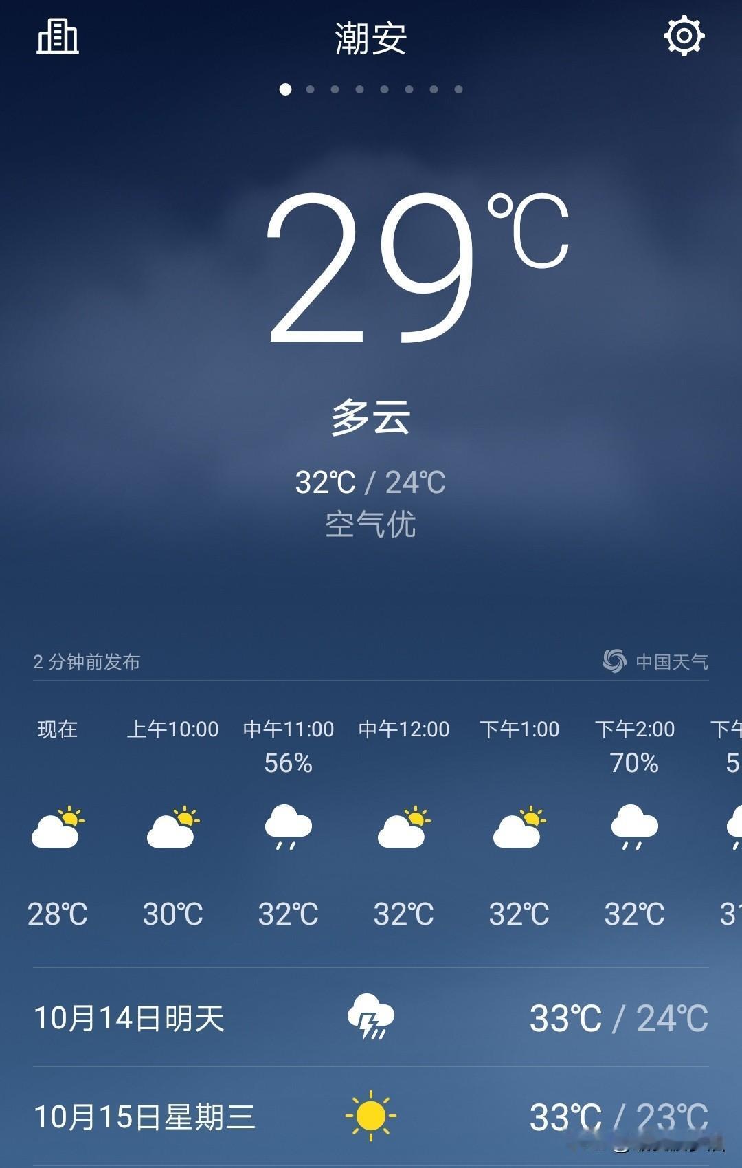 秋老虎发威南方多地热到破纪录, 广东天气晴热为主雷雨冒泡! 13~15日, 粤西、珠江三角洲南部及西部、韶关、清远市县云量较多, 有分散(雷)阵雨, 雨时局部伴有短时强降水、8级左右雷雨大风等强对流天气, 部分市县早晚有轻雾或雾; 其余市县天晴炎热, 最高气温33~35℃。 今天(13日), 潮州喜提一个雷阵雨转多云天气, 气温24~32℃, 此刻气温29℃。 看看今天的天空, 云量明显增多, 阳光若隐若现。 不到九点气温已经升到29℃, 虽然早上下了一点小雨, 但气温也没有下降多少, 这雨不大行啊! 降温力度有待加强。 今天的天气, 算好评吧! 如此天气! 元芳,你怎么看? [捂脸][捂脸][捂脸][捂脸][捂脸][捂脸][捂脸][捂脸]