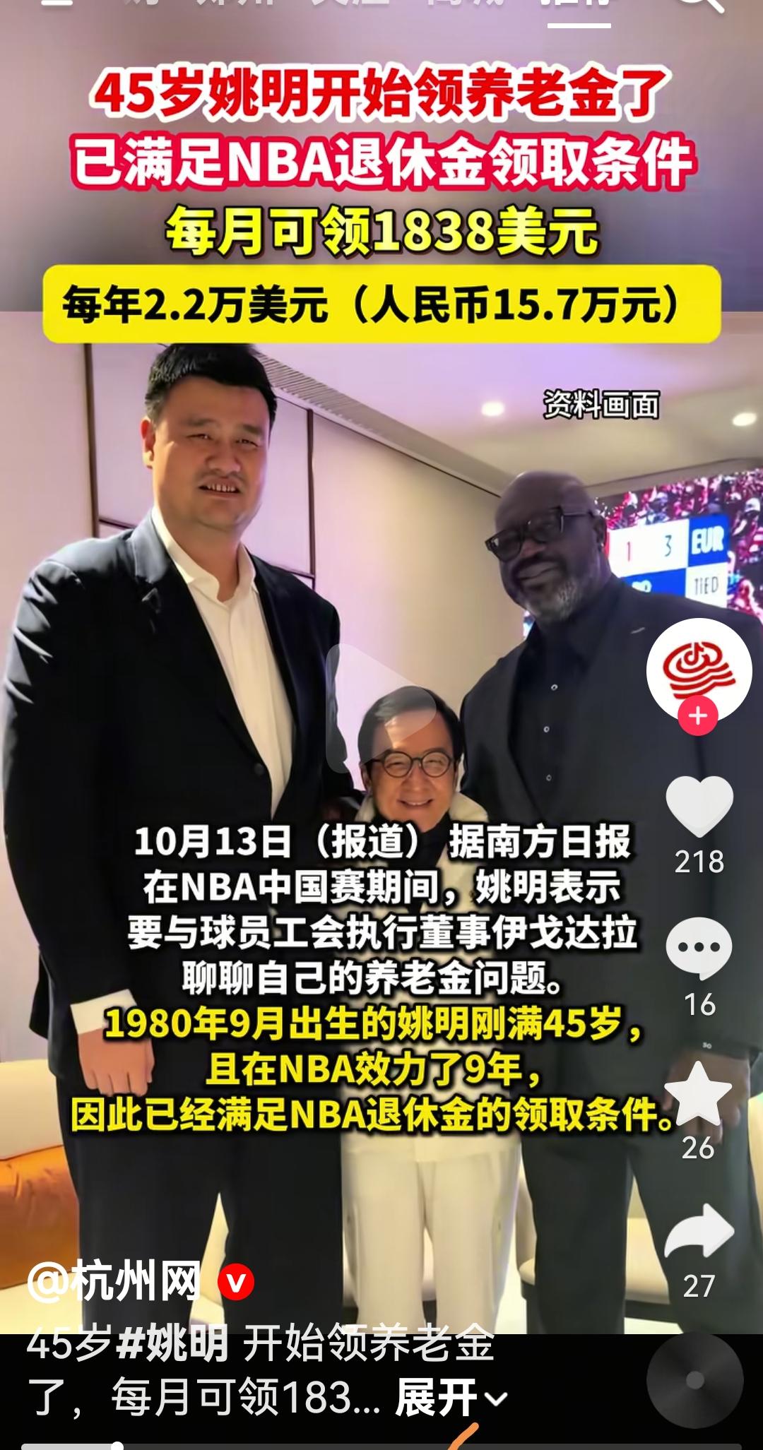 46岁姚明开始领取NBA养老金了 根据媒体报道,在NBA中国赛期间,姚明要和球员工会执行董事聊一聊他的要老金问题 NBA球员养老金分为3个等级 第一档45到50岁:306.24×效力年限×2/3 第二档50到62岁:306.24×效力年限 第三档62岁以上:1666.7×效力年限 现在姚明每月可以领取1838美元,一年2.2万美元折合人民币15.7万 终于领到国外钱了姚明 姚明身高 姚明身高效应 姚明篮球技术 图片来自杭州网视频
