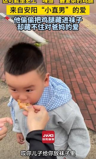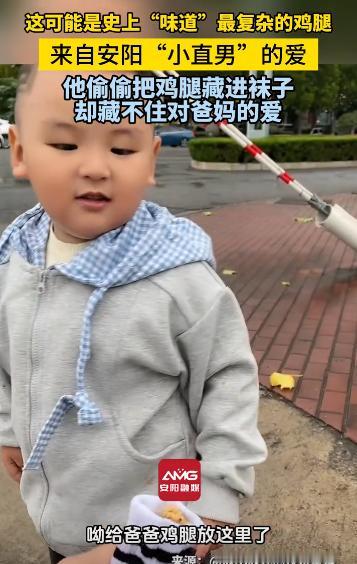 特别的爱!河南,一3岁男孩从幼儿园带回鸡腿给父母吃,担心凉了,脱下一只袜子包好,最终父母并未嫌弃,欣慰的和儿子一起享用。网友:虽然有点好笑,但是真的很感动。 国庆假期后的第一个周五傍晚,河南一所幼儿园门口挤满了接娃的家长。 3岁的小男孩背着印着卡通图案的小书包,从校车上蹦下来就往父母身边跑,小短腿迈得飞快。 可往常一见面就喊“回家吃零食”的小家伙,今天却攥着书包带不肯走,非要把爸妈拉到路边的台阶旁,神秘兮兮地说“有好东西给你们”。 这反常的举动让父母来了兴致,爸爸蹲下身掏出手机,想记录下儿子的“小秘密”。 只见男孩笨拙地拉开书包拉链,从里面掏出一只鼓鼓囊囊的白色袜子。 呦,这啥呀?爸爸疑惑地接过,刚碰到袜子就感觉到里面硬邦邦的,还带着点孩子的体温。 鸡腿!男孩仰着小脸,眼神里满是期待,说话时小胸脯都挺了起来。 爸爸愣了一下,小心翼翼地把东西从袜子里掏出来,果然是一只完整的鸡腿。 表皮还泛着淡淡的油光,只是边缘有点凉了,上面挂着几根袜子的线头。 他这才发现,儿子的左脚光着,小脚丫冻得有点发红。 这只鸡腿的“旅程”,要从幼儿园的午餐时间说起。 当老师把鸡腿分到餐盘里时,其他小朋友都迫不及待地啃了起来,男孩却盯着鸡腿出了神。 他偷偷把鸡腿藏在餐盘底下,心里盘算着带回家给爸妈。 可转念一想,老师说不定会让他吃掉,而且鸡腿凉了就不好吃了。 眼看小朋友们都快吃完了,他突然灵机一动,趁老师转身收拾餐具、其他小朋友打闹的间隙,飞快脱下左脚的袜子,把鸡腿小心翼翼地塞了进去。 整个下午,男孩都揣着这个“秘密”,看到爸爸拿着鸡腿,男孩赶紧上前推了推他的手,小舌头忍不住舔了舔嘴唇。 爸爸笑着把鸡腿递给妈妈,一边拽掉上面的线头一边说,快尝尝,咱儿子特意给你留的。 妈妈咬下一小口,鸡腿的香味在嘴里散开,眼眶一下子就湿了。 她把鸡腿撕成小块,先塞了一块到儿子嘴里,轻声说,谢谢宝贝,真好吃。 而爸爸趁机亲了亲男孩的脸颊,摸了摸他微凉的小脚,下次可别脱袜子啦,脚凉会感冒的。 男孩含着鸡腿,含糊不清地“嗯”了一声,小脸上满是满足。 这事儿传到网上,评论区里热闹极了。 有人说“笑着笑着就哭了,袜子里裹的哪里是鸡腿,是顶顶真的孝心”。 也有人直言“换我可能会犹豫,毕竟袜子确实不太卫生”。 这些孩子的举动在大人眼里或许“笨拙”“不讲究”,但藏在背后的爱却格外真诚。 他们不会用精致的包装,不懂复杂的礼仪,只会用最直接的方式表达在乎。 把好吃的藏起来带回家,用自己觉得最好的东西保护礼物,哪怕那只是一只袜子。 好多家长总在教孩子“要讲卫生”“要懂事”,却忘了孩子的爱从来不管这些规矩。 这份爱不用教,也学不来,是从心里长出来的。 而这份特别的爱,终究会在孩子心里生根发芽,长成未来保护父母的力量。 信息来源:安阳融媒2025-10-13发布视频