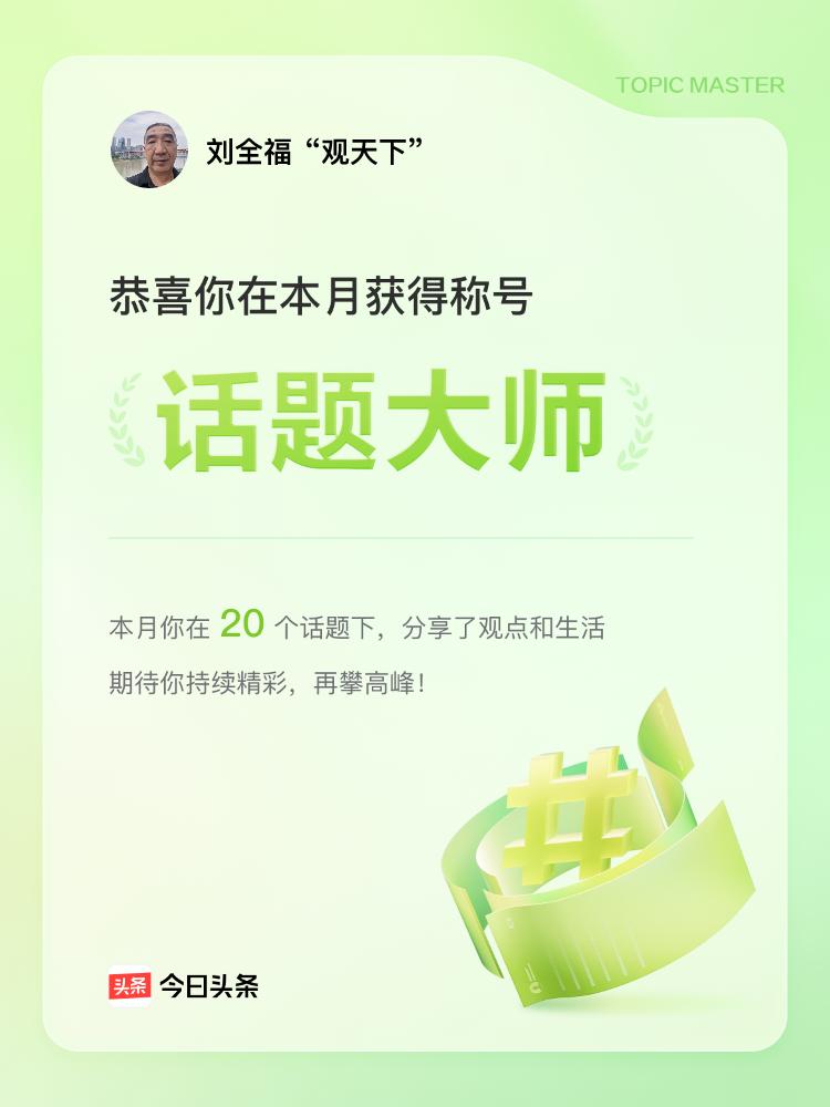 获得今日头条“话题大师”称号,既惊喜又感动。这个称号不仅是对我长期参与话题讨论、