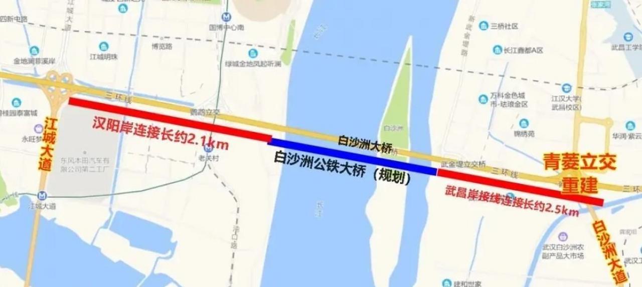 武汉第三座公铁两用长江大桥来了,也是武汉第二座高铁过江通道来了,它就是武汉枢纽直通线过长江的通道,距离既有白沙洲长江大桥南侧70米,建成之后将缓解天兴洲长江大桥的高铁通行压力。 白沙洲公铁两用长江大桥采用“上公下铁”设计,上层为双向6车道城市快速路,下层为4线高铁轨道,公铁合建段总长3812米,总投资额约93亿元 ,计划总工期54个月,即4年半时间。