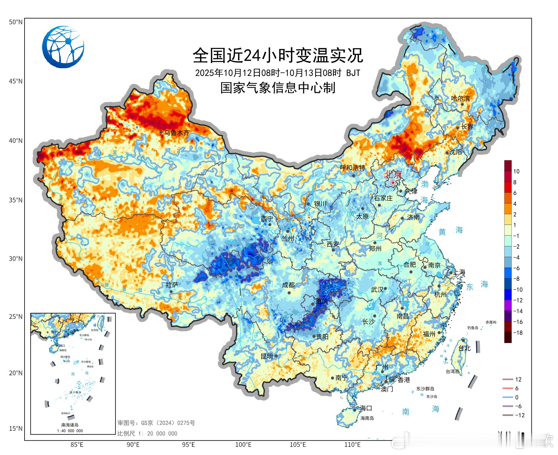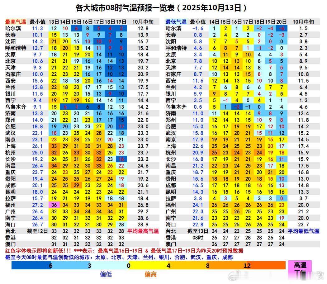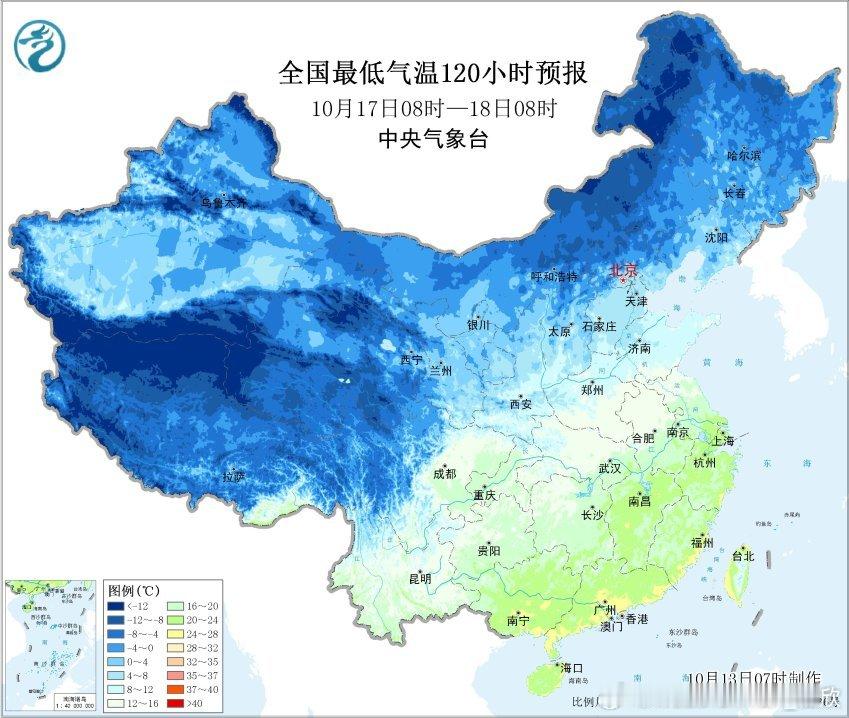 【气温创新低】今晨在冷空气影响下,有9个省会首府直辖市气温创立秋后新低。太原3.4℃、北京7.8℃、天津7.7℃、兰州4.2℃、银川5.9℃、合肥15℃、武汉15.8℃、重庆18.7℃、成都温江16.5℃。预计10月中旬后期还有强冷空气影响我国,又会引发新一轮创新低浪潮,东北和内蒙古多地将跌破0℃,黄淮一带跌破10℃。