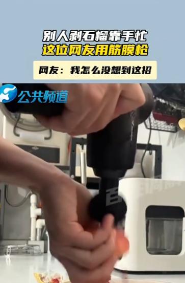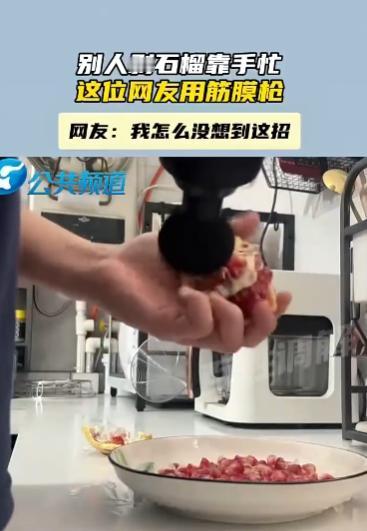 “人怎么能这么聪明!”9月29日,广西,一男子突发奇想用筋膜枪剥石榴,筋膜枪枪头一震动,鲜红的榴子哗啦啦全掉了下来,整个过程毫不费力,也不脏手,网友:我怎么没想到这招! 石榴鲜甜多汁,营养价值高,很多人都喜欢吃石榴,可剥石榴是一件比较麻烦的事儿,掰开石榴后,里面的榴子紧密排列在一起,需要人们一粒粒剥出,不仅费功夫,有时还会弄的满手汁水。 一男子吃石榴时嫌麻烦,他看到一旁用来按摩的筋膜枪灵机一动,既然筋膜枪可以按摩人的肌肉深层,那为什么不能给石榴来一次深度“按摩”,这样榴子不就全掉下来了吗? 想到这里,男子将石榴掰成两半,他一手拿着一半石榴,一手拿着筋膜枪就开始操作,当筋膜枪高速震动的枪头接触到石榴外皮后,内部鲜红的榴子哗啦啦全掉了下来。 见筋膜枪真的有用,男子惊喜不已,继续用筋膜枪震动剩下的石榴,掉下的榴子装满了整整一大盘,整个过程毫不费力。 网友直呼自己怎么没想到这招,不少人纷纷效仿男子的做法,这样一来,以后剥石榴再也不用费劲,不用弄得手上都是黏腻的汁水,一盘子剥好的榴子吃起来别提有多爽了! 信息来源:《别人剥石榴靠手忙,这位网友用筋膜枪》大象新闻