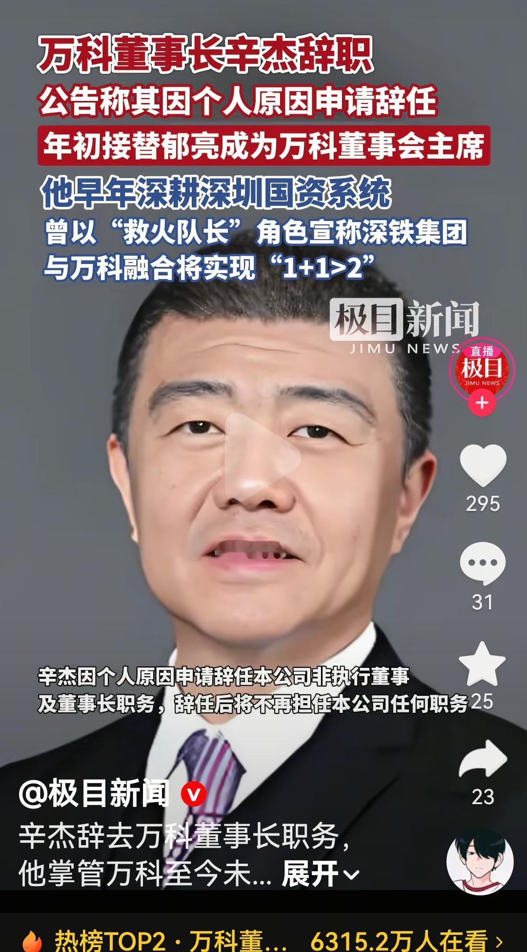 万科董事长辛杰辞职 根据媒体报道,万科公告说是他因为个人原因辞职 年初接替郁亮成为万科董事会主席,这还没有一年啊 曾经以“救火队长”说万科和深圳国资委是1+1大于2看来这次万科没那么顺利啊 万科背靠深圳国资委都不行 那些小卡拉米房地产商更不行了 现在感觉王健林已经很不错了这几年撑过去就过去了 ,撑不过去就是回到当初万科 万科资金困局 万科企业危机 深圳万科 图片来自极目新闻视频