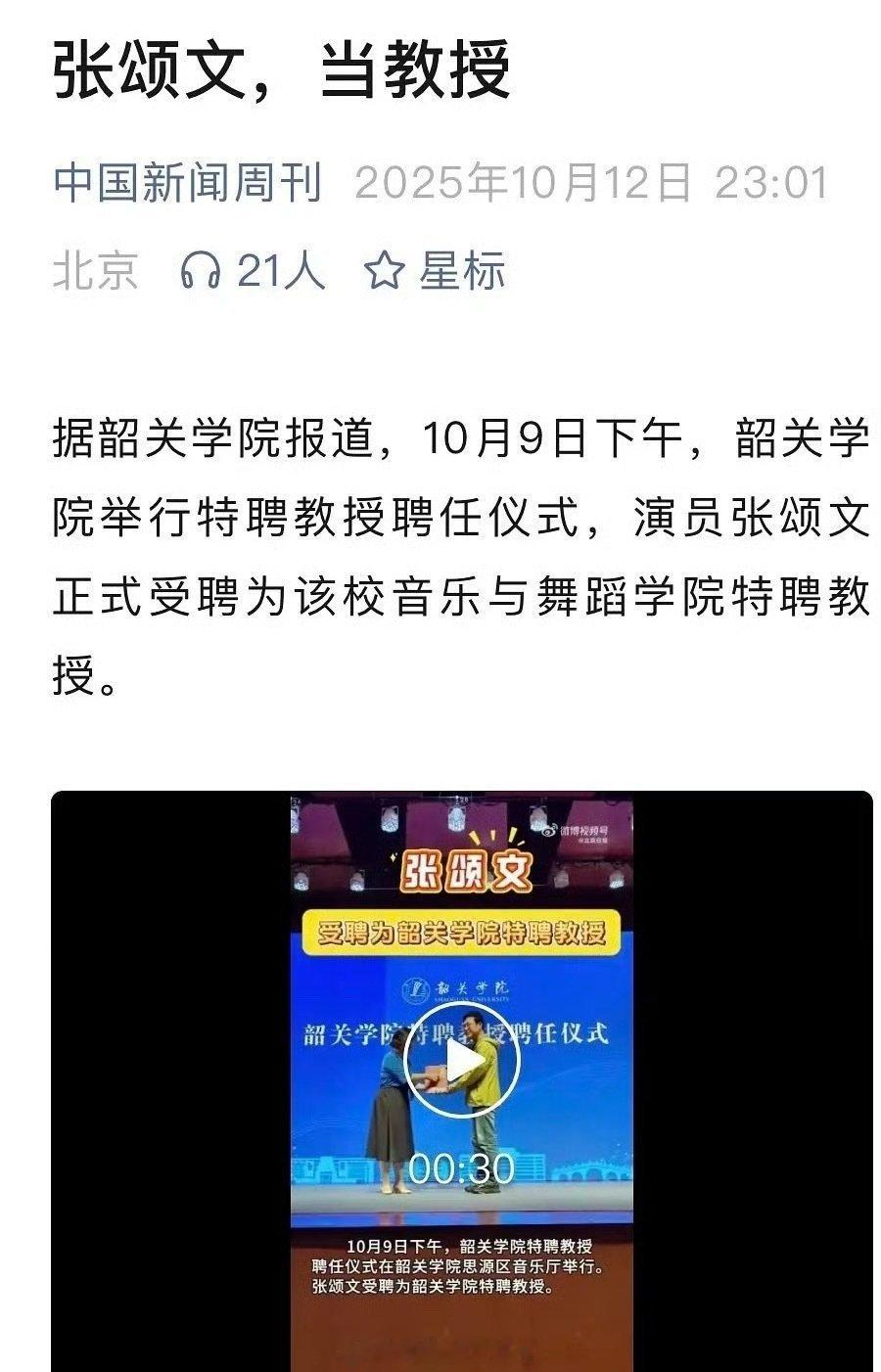 张颂文有新身份了:韶关学院的音乐与舞蹈学院的特聘教授。