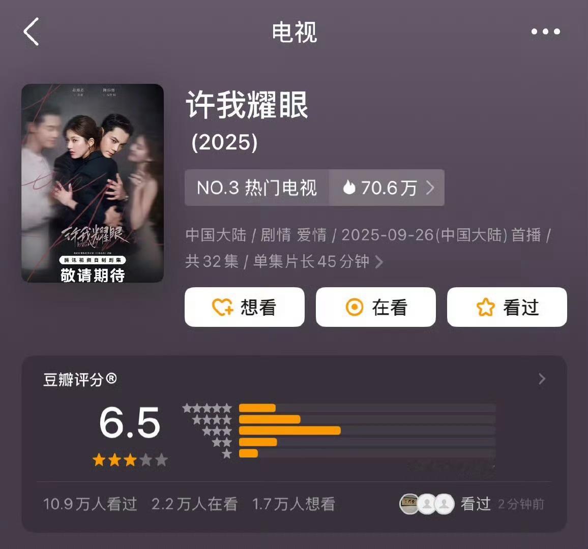 娱乐[超话]许我耀眼低了许我耀眼豆瓣开分低了许我耀眼豆瓣开分低了,咋才6.5