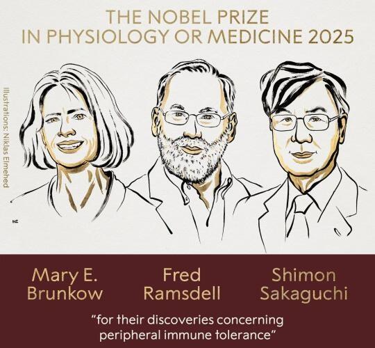 2025年诺贝尔奖回顾 P1:2025年诺贝尔生理学或医学奖授予了美国科学家玛丽·E·布伦科(Mary E. Brunkow)、弗雷德·拉姆斯德尔(Fred Ramsdell)和日本科学家坂口志文(Shimon Sakaguchi),以表彰他们在外周免疫耐受方面的发现。 P2:2025年诺贝尔物理学奖授予了英国科学家约翰·克拉克(John Clarke)、法国科学家米歇尔·H.德沃雷特(Michel H. Devoret)和美国科学家约翰·M. 马蒂尼斯(John M. Martinis),以表彰他们发现宏观量子隧穿效应以及电路中的能量量子化现象。 P3:2025年诺贝尔化学奖授予了日本科学家北川进(Susumu Kitagawa)、英国科学家理查德·罗布森 (Richard Robson)、约旦裔美国科学家奥马尔·M.亚吉(Omar M. Yaghi) ,以表彰他们对金属有机框架发展的贡献。 诺贝尔奖 2025诺贝尔 外周免疫耐受 宏观量子隧穿 金属有机框架 科普 科学 环球科学