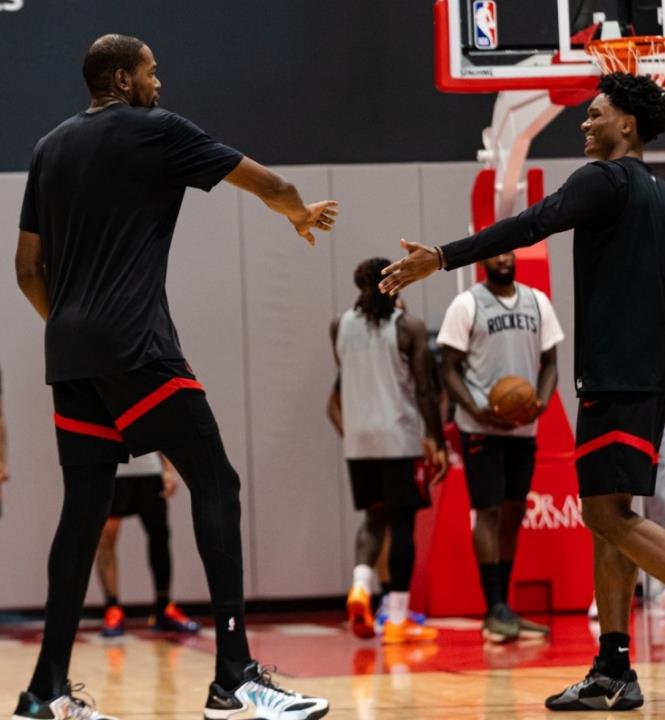 除了比赛之外,休斯顿火箭队这几天也没闲着,基本上每天他们都在乌度卡的带领下进行训练,因为火箭队要到两天之后才会前往客场打比赛。火箭队方面也晒出了最新的训练照,我们也看到大部分火箭队球员都出现在了球场上。甚至根据报道,火箭队的泰特伤势已经好转,他有可能出战和雷霆队的第1场常规赛。而老将芬尼史密斯现在已经进行了投篮训练,虽然还不能参加对抗训练,但是芬尼史密斯的伤势也比以前有些好转。范弗里特确实是不能登场,他目前还在养伤当中,估计9~12个月之后才能复出,因此火箭队早已将阿门汤普森和谢泼德当成了两位主力控球后卫。 在训练照当中,我们看到了阿门汤普森和杜兰特非常开心地在一起击掌庆祝。看起来老将杜兰特已经毫无悬念地融入到了火箭队当中,他和年轻的球员们相处得非常融洽,毕竟这里有亚当斯、杰夫格林这样的老将,都是杜兰特当年的队友,所以火箭队接纳杜兰特没有什么问题。杜兰特只要能融入到火箭队当中,这支球队的战斗力就不可小视。