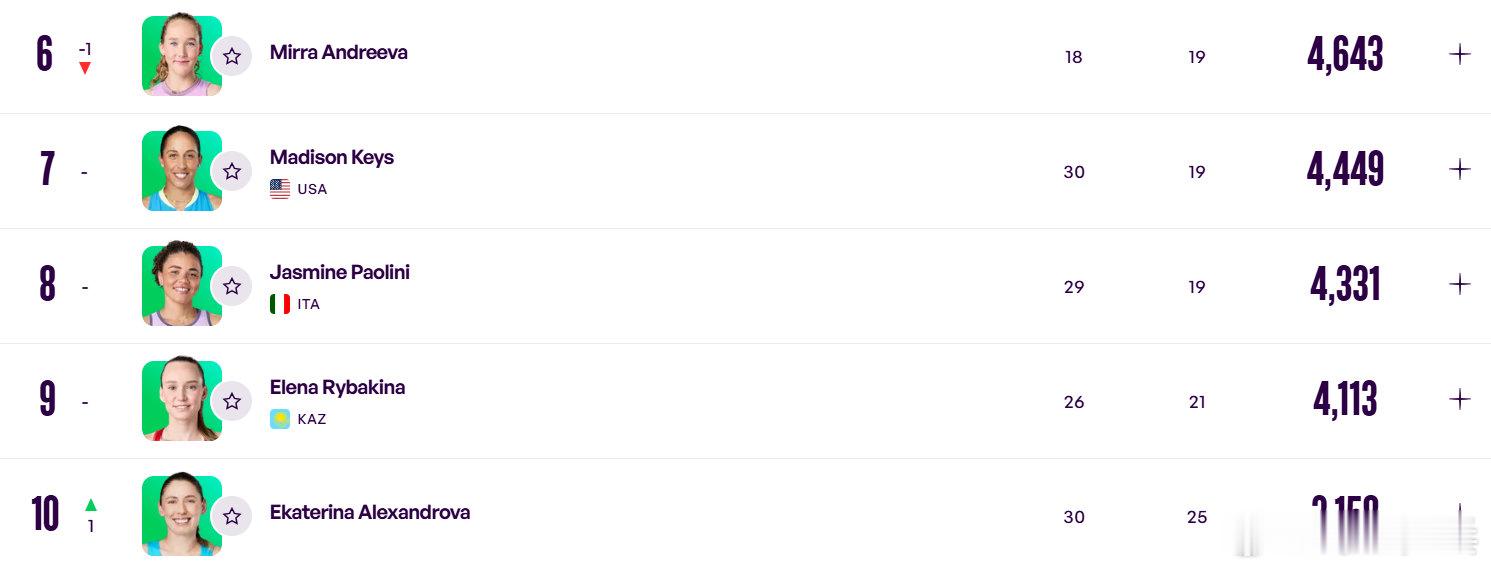 6-10:安德列娃4643、凯斯4449、鲍里妮4331、莱巴金娜4113、亚历山德洛娃3158