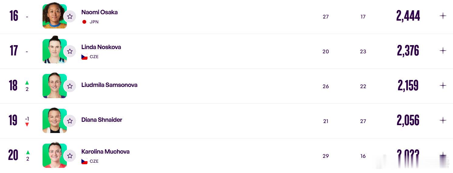 16-20:大坂直美2444、诺斯科娃2376、萨姆索诺娃2159、施耐德2056、穆霍娃2023