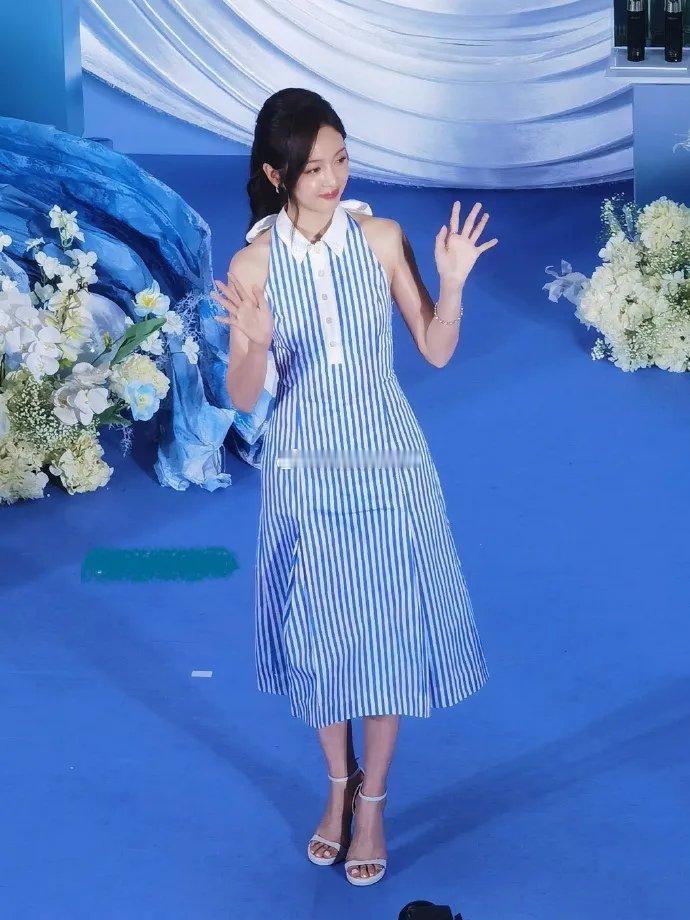 吴宣仪在出席活动的时候穿了一件蓝色的条纹裙,看起来像个靓丽的美少女,感觉和出道的