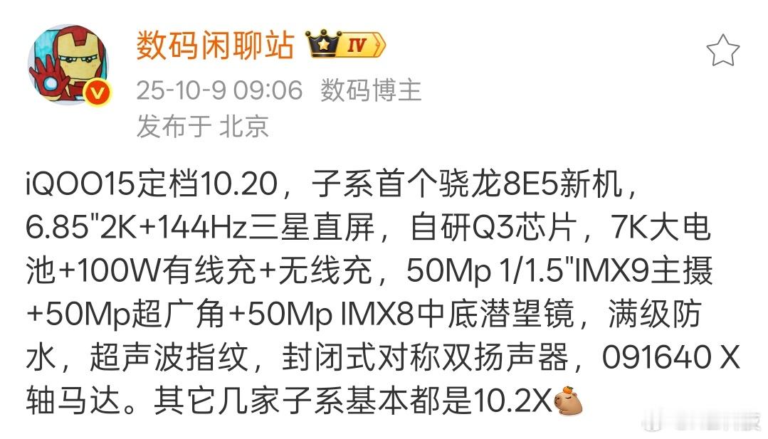 iQOO15新品发布会定档10月20日19点,性能旗舰来了,具体配置见图1
