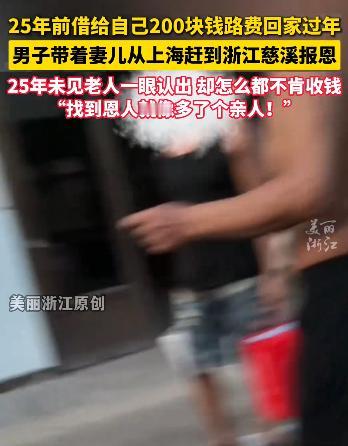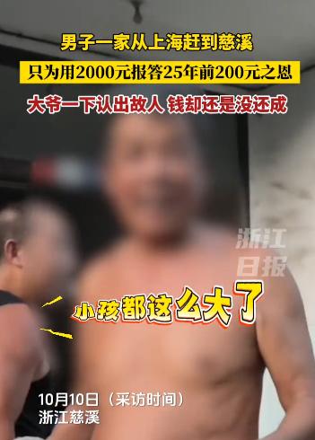 暖心!男子带着家人从上海到浙江慈溪找寻25年前给他200元路费的恩人。没想到,他们一见面,老人一口叫出了他的名字。他掏出2000块钱塞给老人报答恩情,老人不肯收,他们和老人聊到天黑才返程回家。 浙江慈溪的暮色里,80岁的张大爷望着门口拎着礼品的陌生人,眯起眼睛看了两秒,突然开口。 你是当年那个在五金厂打工,没路费回家的小周吧? 话音刚落,站在门口的周先生眼眶一下子热了。 他从上海开车300多公里赶来,没想到分别25年,老人还能一眼认出他,连名字都记得清清楚楚。 时间拉回2000年的冬天,20出头的周先生揣着简单的行李,在慈溪一家五金厂打工。 那时候他年轻不懂事,工资到手就随手花了,等到春节前要回安徽老家,才发现口袋里连买火车票的钱都没有。 就在他无措的时候,同在工厂干活的张大爷看出了端倪。 问清情况后,张大爷没多犹豫,从贴身口袋里摸出200块钱递过来。 拿着吧,过年总得回家,那时候的200块可不是小数目,当时慈溪普通打工者的月工资也就几百块钱。 周先生攥着那两张皱巴巴的钞票,心里暗暗发誓,以后一定要回来,亲手把钱还了,好好谢大爷。 这份誓言一藏就是25年,周先生后来辗转到上海打拼,成家立业,日子慢慢好起来,但寻恩的念头从没断过。 “不是不想来,是总被工作、家庭的琐事绊住,加上记不清大爷具体住址,就一拖再拖。” 直到今年秋天,妻子听他又提起这事,忍不住说,别等了,我陪你走一趟。 10月的一个周末,周先生带着妻子和孩子,开着车往慈溪赶。 一路上他既期待又忐忑:工厂还在吗?大爷身体还好吗?这么多年过去,人家还能记得自己吗? 车子驶入慈溪城区,凭着模糊的记忆,他先找到了当年的五金厂。 厂房还立在原地,红砖墙褪了色,门口的梧桐树比当年粗了一圈,可厂区里空荡荡的,早就换了主人。 顺着工厂周边的老街打听,有人依稀记得张大爷的住处。 等周先生找到那片老居民区时,才发现出门太急没带礼品,又赶紧开车找超市买了牛奶、水果。 敲响那扇斑驳的木门时,周先生的手都在抖。 门开的瞬间,出现的正是头发花白但精神矍铄的张大爷。 没等他开口,大爷就先叫出了他的名字,这一幕让周先生鼻子一酸,大爷,我找您找了25年! 他赶紧把妻子和孩子拉到跟前,一一介绍给大爷认识。 进屋坐下没多久,周先生从包里拿出2000块钱塞给张大爷,可大爷手一挡推了回来。 当年那点事,早忘了,哪能要钱?见周先生坚持,大爷又笑着补充,礼品我收下,这钱你赶紧装起来,不然我要生气了。 两个男人坐在堂屋的竹椅上,从2000年工厂里的趣事聊到现在的生活。 张大爷说自己早就不干活了,每天种种花、散散步;周先生讲起这些年在上海的打拼,还有家里的孩子。 不知不觉间,窗外的天色彻底黑了,墙上的挂钟指向晚上7点。 临走时,张大爷一直送到巷口,反复叮嘱,以后路过就来坐坐,别总想着带东西。 车子驶上返程的高速,周先生看着窗外掠过的灯火,心里满是踏实的愉悦。 这段经历被他随手发在网上,很快引来无数网友热议。 有人说:“25年前的200元是救命钱,25年后的惦记是真良心”。 还有慈溪网友留言:“我们这儿的老人都这样,见不得别人难”。 更有人感慨:“这哪是还钱,是把当年的善意接过来再传下去。” 200元与2000元的数字对比,从来不是故事的重点;大爷脱口而出的名字,周先生跨省奔波的脚步,才是人间最珍贵的底色。 就像周先生说的:“找到大爷,不光是还了钱,更像是给青春里的那束光一个交代。” 信息来源:浙江日报2025-10-11发布视频