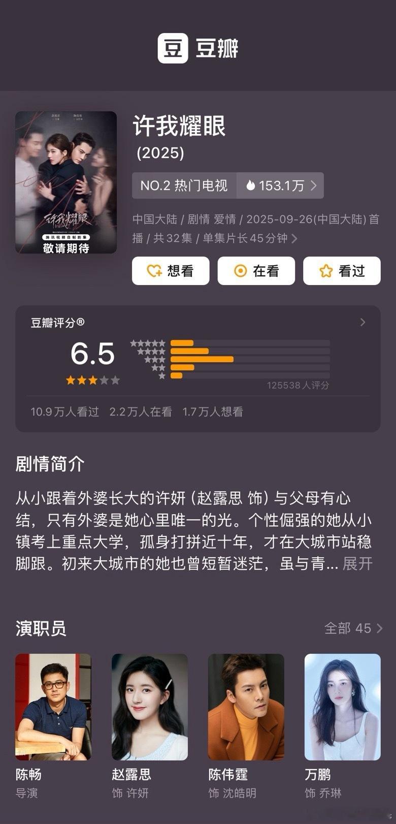 赵露思、陈伟霆许我耀眼豆瓣开分6.5