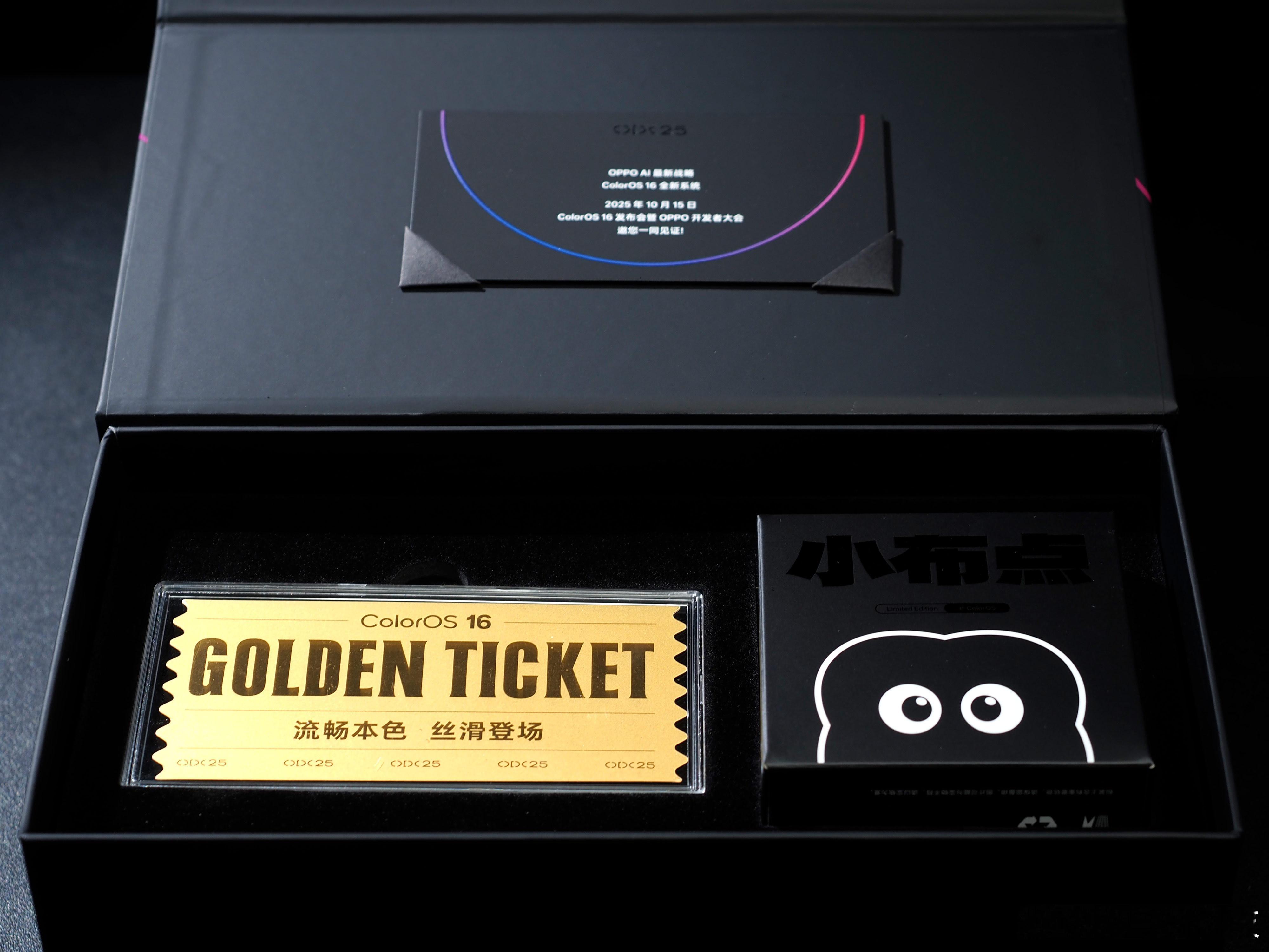 收到了ODC25 OPPO开发者大会 邀请函,一个小黑盒子里惊喜满满!有《查理和巧克力工厂》电影里的同款巧克力金票,有没有一种中奖的感觉?有了它是不是就可以一生纵享丝滑!还有一个OPPO的全新IP“小布点”,毛绒绒手感倍儿好,它代表了这次 ColorOS16 的AI,一个小布点,专属定制,更懂你[馋嘴]