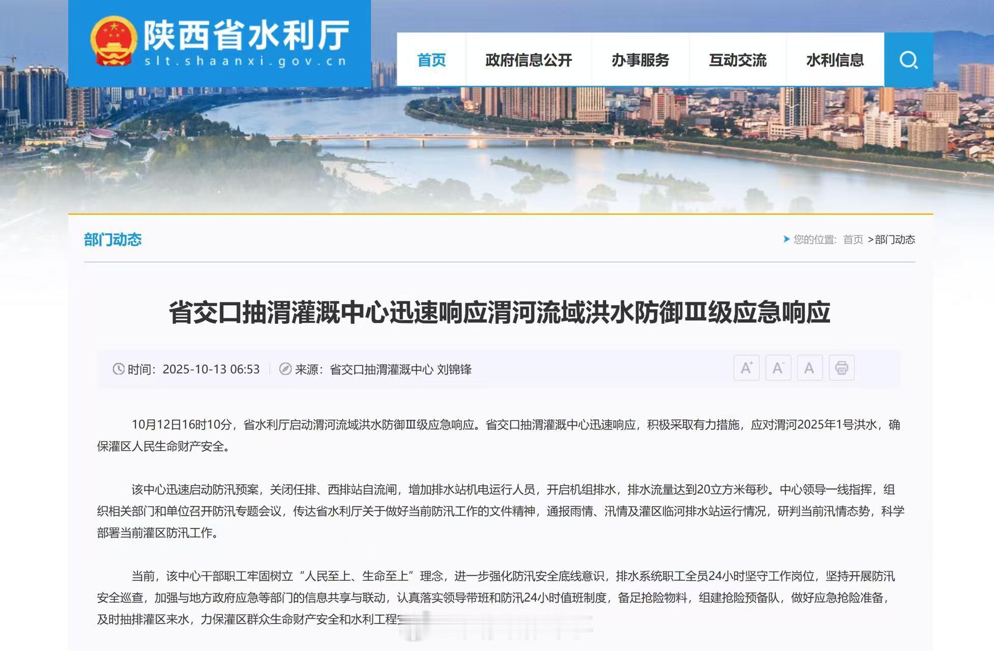 【陕西渭河流域洪水防御三级应急响应】西安被列入洪水防御Ⅲ级应急响应 据陕西省水利厅最新发布,10月12日16时渭河魏家堡站流量3130立方米每秒,省水利厅于10月12日16时10分将渭河流域西安、宝鸡、咸阳、渭南、杨凌示范区洪水防御Ⅳ级应急响应升级为洪水防御Ⅲ级应急响应,启动渭河流域洪水防御Ⅲ级应急响应。省交口抽渭灌溉中心迅速响应,积极采取有力措施,应对渭河2025年1号洪水,确保灌区人民生命财产安全。