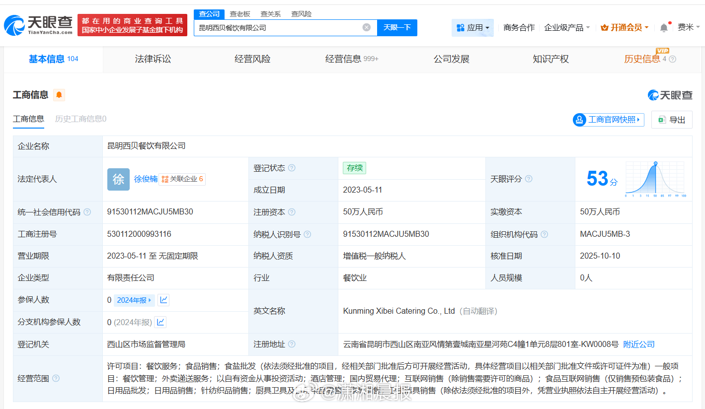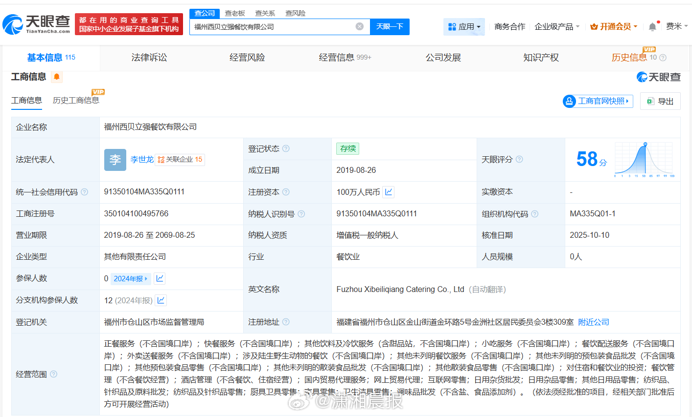 福州西贝喜悦餐饮有限公司成立于2019年10月,注册资本100万人民币,经营范围包括餐饮服务、食品经营、食品互联网销售、外卖递送服务等,由内蒙古西贝餐饮集团有限公司、深圳同力餐饮管理合伙企业(有限合伙)共同持股。值得一提的是,今年9月,贵州西贝万家餐饮管理有限公司、广州西贝餐饮有限公司、珠海市西贝餐饮有限公司发生高管变更。