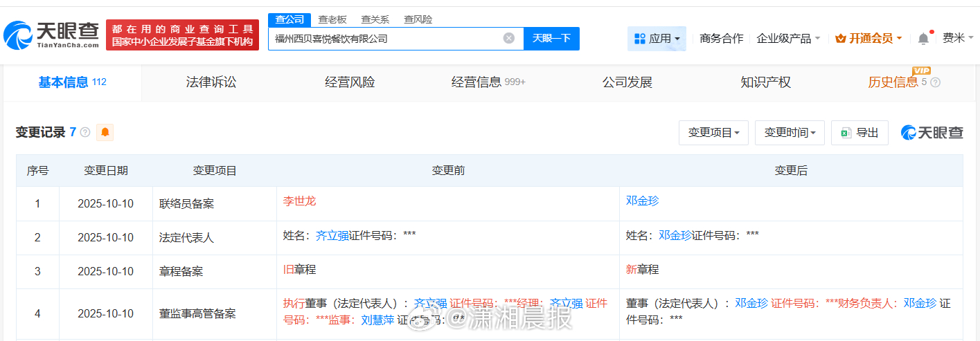 【#西贝旗下近十家公司近期变更高管#】10月13日,从天眼查获悉,近日,福州西贝喜悦餐饮有限公司发生工商变更,齐立强卸任法定代表人、执行董事、经理,邓金珍接任法定代表人并担任董事。此外,昆明西贝餐饮有限公司、福州西贝立强餐饮有限公司、厦门西贝红火餐饮有限公司、厦门西贝餐饮有限公司近期也发生高管变更。