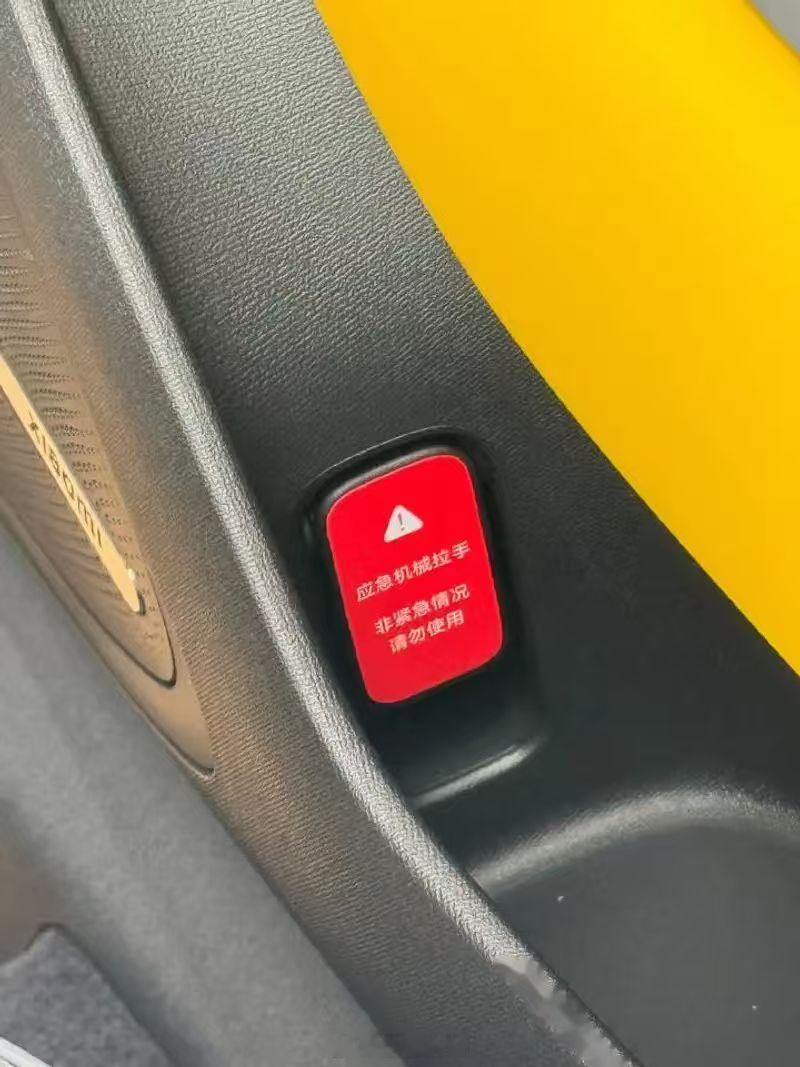 其实按图1这个造型,它也不能证明完全是机械式的。事实上,这个感官上的“机械式”,它本质上还是电子门把手。只不过呢,现在小米SU7 Ultra车内是有机械拉手的,并且由于之前某起事故的原因,还添加了“应急机械拉手”标识(见图2)。但看情况,很有可能当时驾驶员已经昏迷,或者丧失行动能力了,所以只能靠车外人员开门。