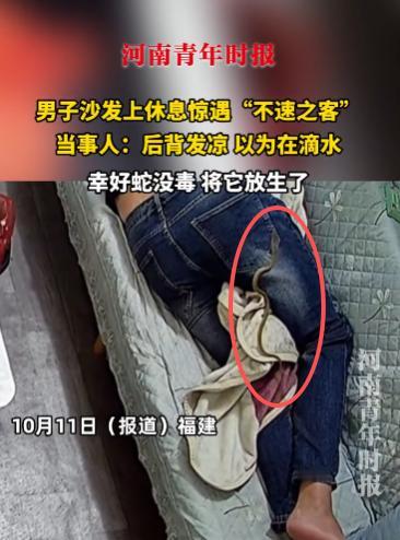 “太吓人了!”10月11日,福建,一男子躺在沙发上休息时突然屁股一凉,一条小蛇悄