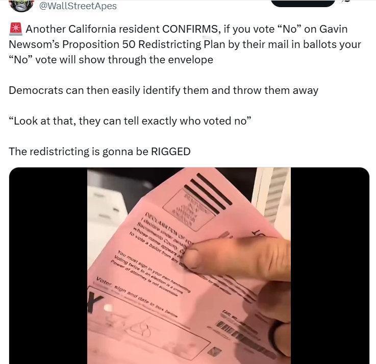 美国一位加州居民称,如果你在邮寄选票上对加文·纽森的第50号重新划分选区提案投“反对”票,你的“反对”票会透过信封显现出来。 民左党人因此可以轻易辨认出这些选票并将其丢弃。 “看吧,他们能清楚知道谁投了反对票。” 重新划分选区将被操纵!