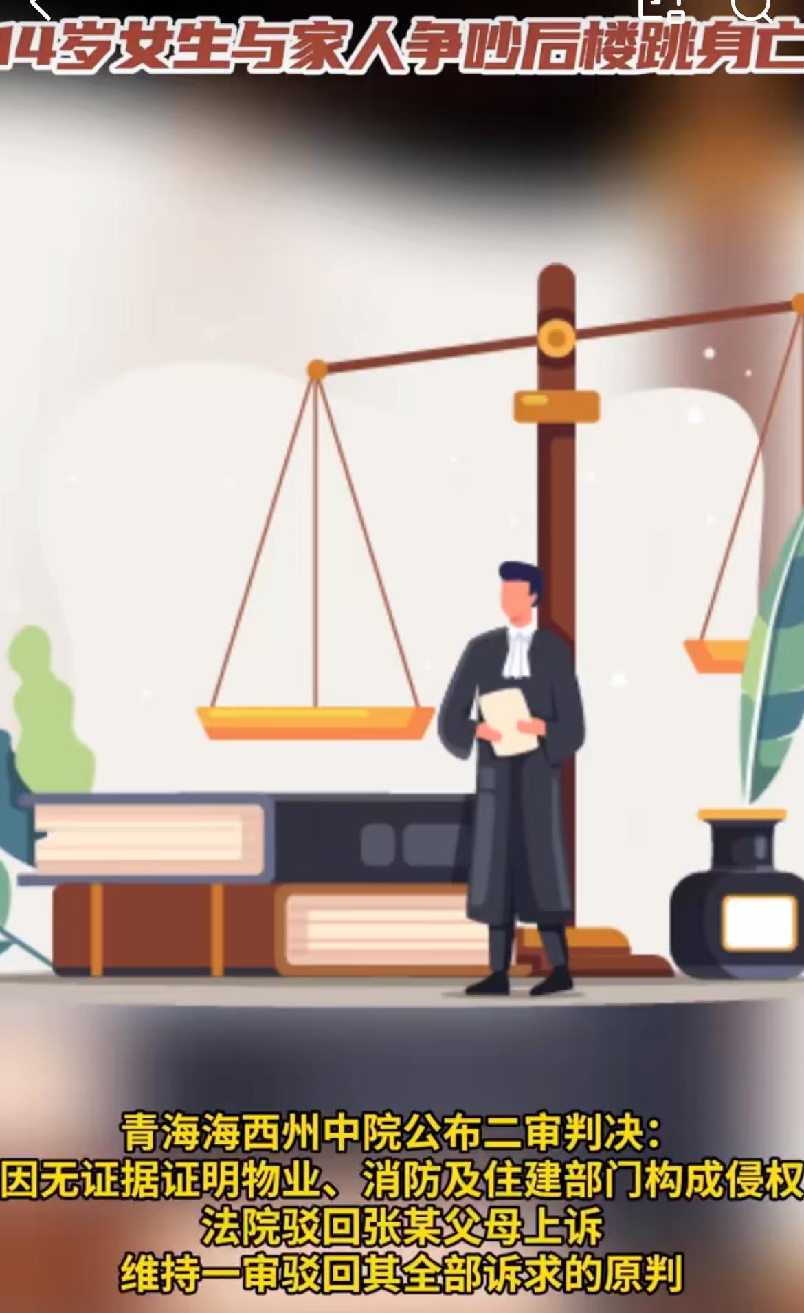 这父母也太荒唐,14岁女儿18楼跳楼自杀,竟然找物业、消防索赔60万。事发青海海西州,14岁初三女生沉迷玩手机,不写作业,和母亲发生激烈争吵,母亲一气之下把手机砸了,女孩想不开从18楼跳楼自杀。这一起家庭悲剧,作为父母应该做的是反思,他们却责怪起小区物业、消防部门以及住建部门。难道这些部门要去看好你家孩子吗?自己家庭教育出问题,却怪天怪地,要找个垫背的。对于这样无理取闹的父母,法院没惯着他们,一审二审都是败诉。十五岁孩子跳楼 跳楼事故