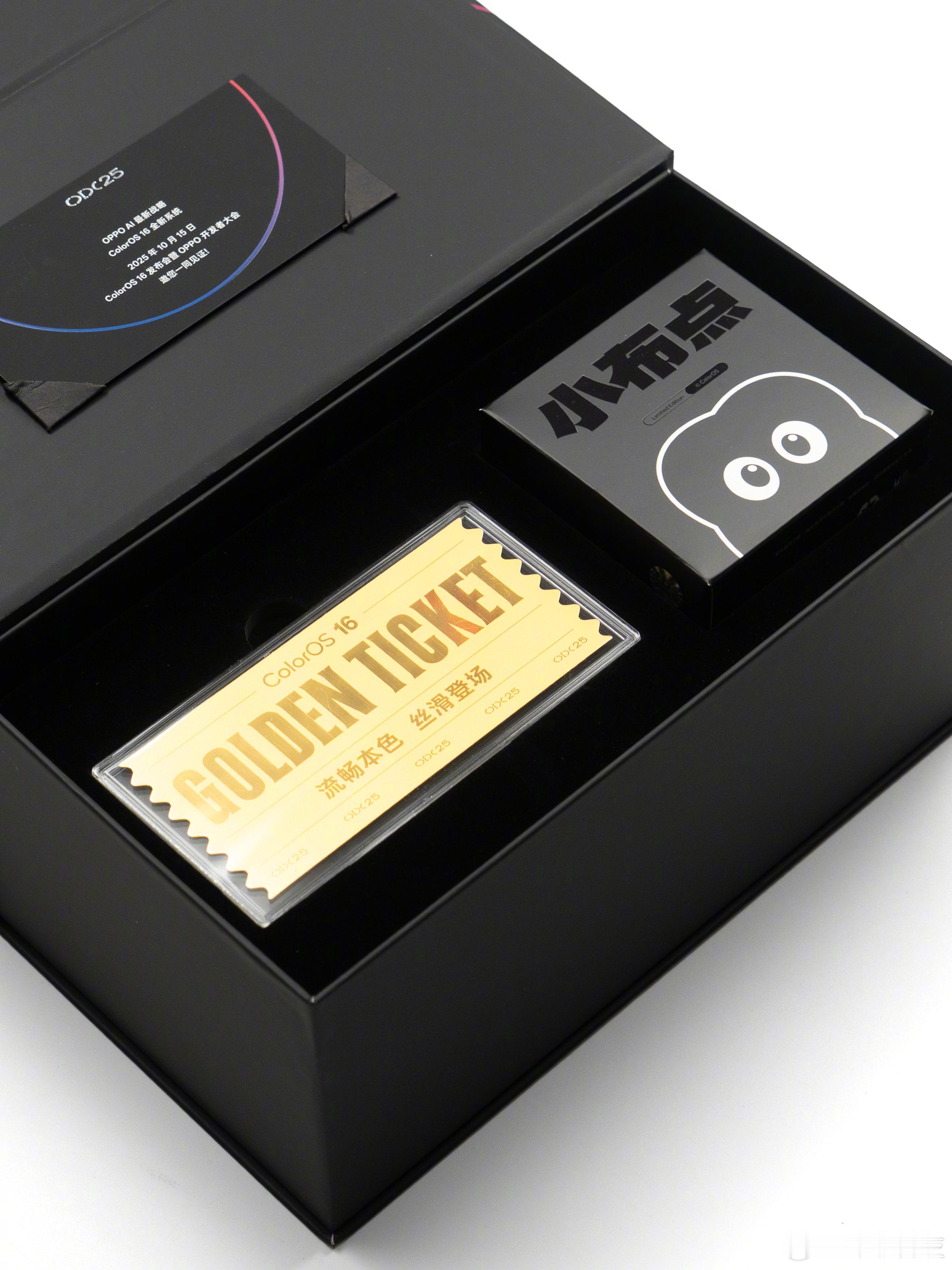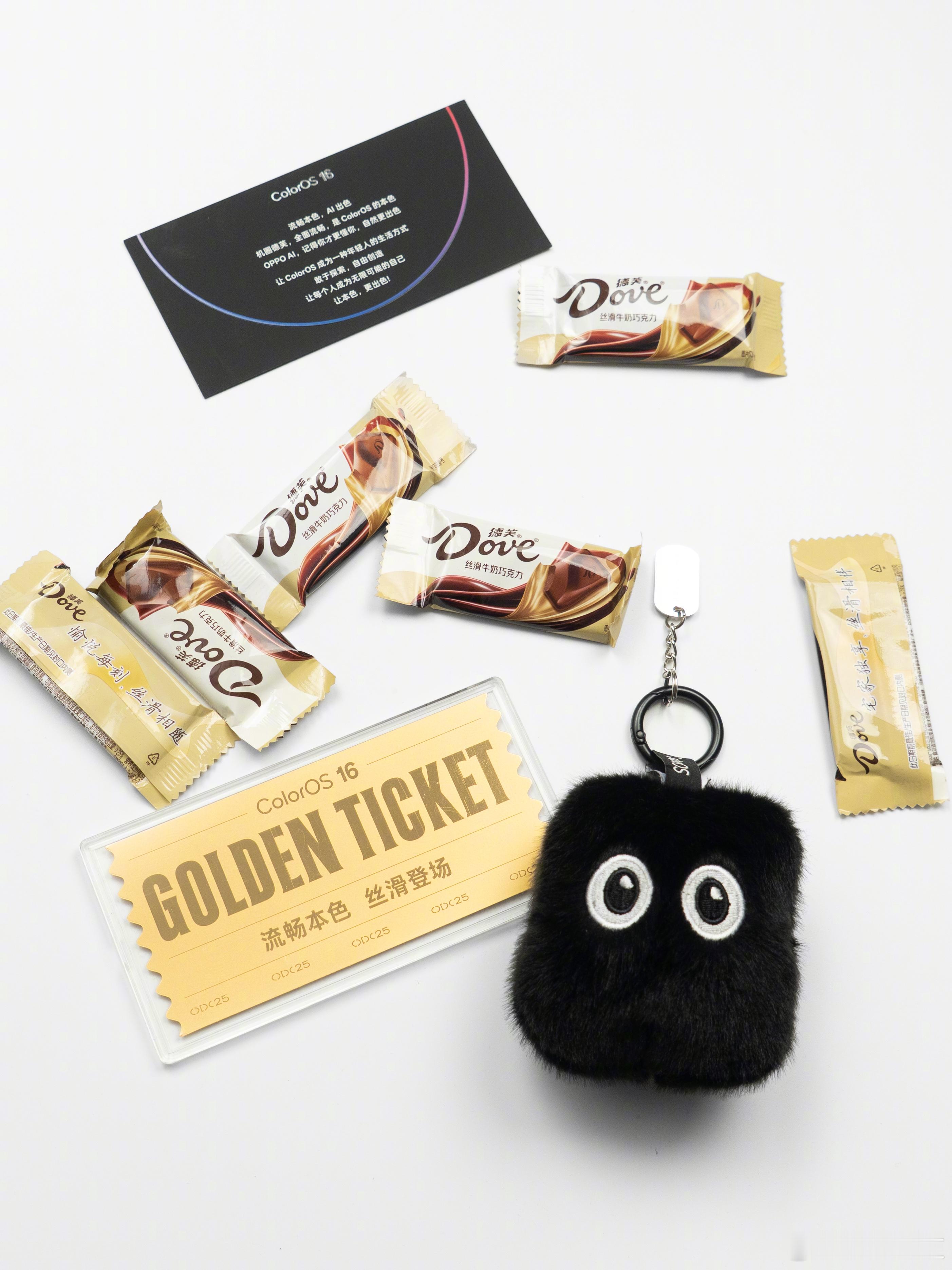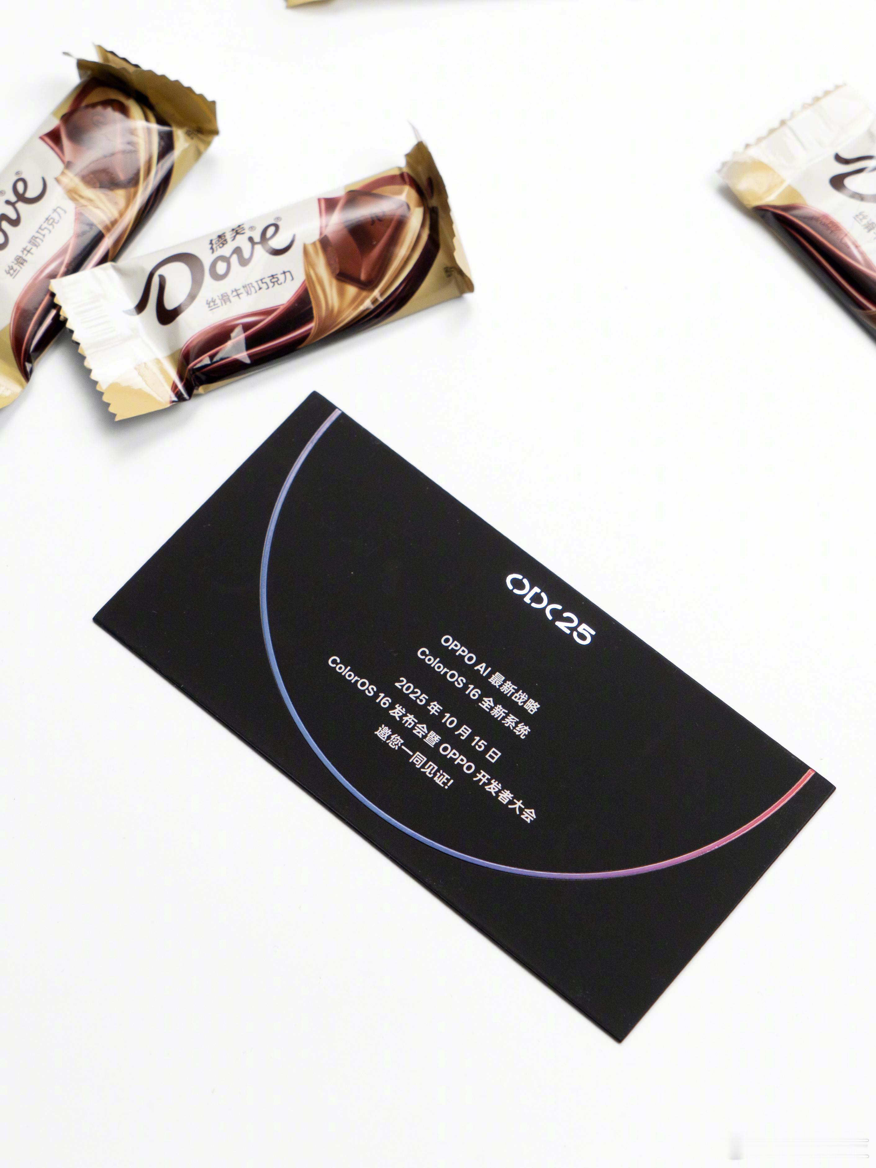 收到了ColorOS 16发布会暨OPPO开发者大会的邀请函,含0.1g纯金的定制纪念金票+OPPO小布点毛绒挂件+德芙巧克力。