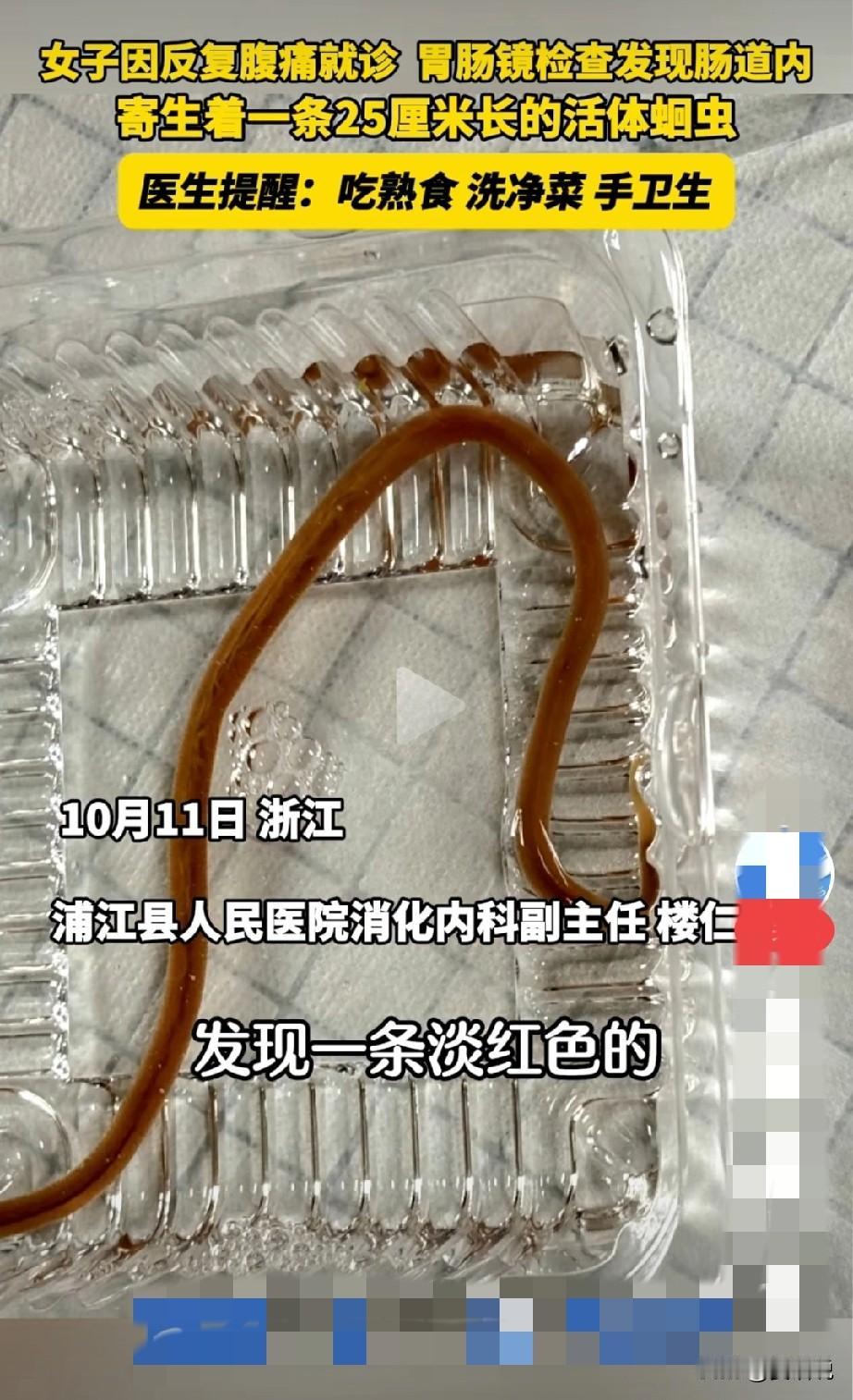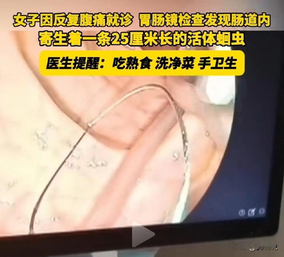 女子仿佛腹痛,经查腹中有25cm长活体蛔虫。小时候,小孩吃宝塔糖,第二天能拉蛔虫