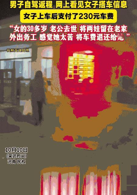 近日,河南民权,男子自驾回宁波,联系了一个30多岁的女子搭车。闲谈中得知女子的丈夫去世,她为了抚养一个13岁和一个5岁的孩子独自在外打工,男子一阵心酸,接下来的举动令女子动容。 麻烦各位读者点一下右上角的“关注”,留下您的精彩评论与大家一同探讨,感谢您的强烈支持! 国庆假期刚刚结束,许多人踏上了返程的路。李师傅和朋友们在老家聚了几天,为了节省路费,决定开车回宁波。 临行前,他们在拼车平台上发了个消息,没多久就有一位女士联系,说同样要去宁波,可以顺路搭一程。 出发那天一早,天色还没大亮,李师傅一行人到了约定地点。那位女士提着一个旧包,步履匆匆地赶来。 她上车后第一时间就付了车费,几乎没怎么说话,只是礼貌地点头。车厢里气氛安静,大家各自刷着手机,偶尔聊上几句工作和家乡的变化。 大约行驶了两小时,女士的手机响起,是视频电话。她犹豫了一下,还是接了。电话那头传来孩子的声音,问着妈妈什么时候回来,能不能带点想吃的东西。 女士声音温柔,耐心地安慰着孩子,努力让自己听起来轻松。但挂断后,她悄悄背过身去,低头擦了擦眼睛。 其实,大家都听见了电话内容,只是没人愿意打破这份沉默。直到又过了一段时间,李师傅才轻声问她工作和家庭的情况。 女士这才慢慢讲起自己的故事:丈夫因病去世,家里欠了不少外债,两个孩子都还小,只能留给老人照看。 她独自一人远赴外地打工,收入虽然不高,却是家里唯一的依靠。每个月挣的钱,除了房租和生活,几乎都寄回了家。 听着她的讲述,车里的气氛悄然变化。大家都知道,外出打拼的人,总有说不尽的难处。但一个女人带着两个孩子,独自撑起一个家,光想想都让人心头发紧。 车队到达宁波已经是傍晚。按约定,女士要在市郊下车,自己再转公交去工厂。可李师傅和朋友们临时决定,干脆送她到厂门口。 送到目的地时,女士再次道谢,准备下车。就在这时,她突然收到车费被退回的提示。她一时愣住,不明白发生了什么。 李师傅解释说,这些路费对他们几个人来说不算什么,可对她来说,或许能缓解一点生活的压力。女士听后,久久说不出话,最后只是不断鞠躬道谢,脸上写满了感激和释然。 那个傍晚,宁波的天正好下着细雨,马路边的路灯把人影拉得很长。女士背着行李,走进厂区时显得格外瘦小。但车里的几个人都觉得,这一路上的善意,是这个城市最温暖的底色。 事后,李师傅的朋友把这段经历发到了网上,引发了很多人的共鸣。有人说,打拼的人都不容易,能理解这种举手之劳的善意;有人留言,自己也曾在异乡得到陌生人的帮助,至今难忘。还有人感慨,230元虽不多,却能让人心头一热,缓解一点点人生的艰辛。 其实,拼车、顺路、帮一把,这些看似普通的小事,背后藏着太多人与人之间的温情。 当我们在生活中遇见别人的不易时,哪怕只是一个小小的善举,也许就能让对方看到希望。或许,这就是这个社会最动人的力量。 你们怎么看呢?
