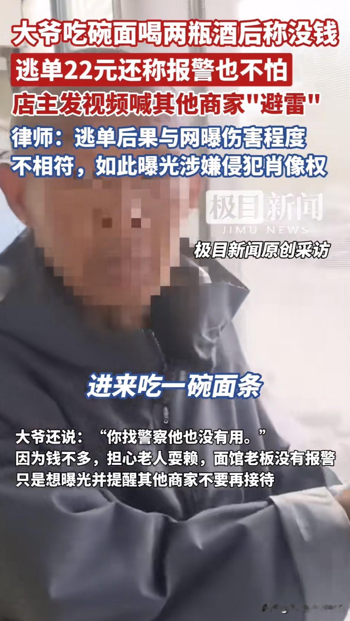老人吃霸王餐不给钱没人管商家拍视频提醒其他商户注意却被指责侵犯老人肖像权 人家办这事就是奔着放下脸面去的提什么肖像权不肖像权的纯属多余 近日吉林白城一老人进到一家面馆点了一碗面一瓶白酒中途喝完又让老板加了一瓶酒,酒足饭饱后跟老板说没钱然后自顾着朝店外走去没有表现出丝毫歉意。面对店家说报警老人直言不用报警没用这点钱不会管 最后店家确实也没有报警只是拍下老人视频发到社交平台希望其他商家不要接待这名老人也算是给大家提个醒,视频一经发出有律师站出来表示老人逃单的金额与店家发不打码视频形成的影响明显不对等,以此老人遭受网暴店家属于侵犯他人肖像权涉嫌违法 店家说老人就是抱着不付钱的心态进店,如果事先告知他说没钱别说一碗面吃多少他都不会说什么,但老人吃完饭说一句没钱就走的行为让他不能接受 商家一没有捏造事实二没有谩骂侮辱的言论只是曝光吃霸王餐的行为如果这都违法那是不是人人都可以去效仿这种行为这个社会不就乱套了吗? 大家觉得店家曝光的行为违法吗?
