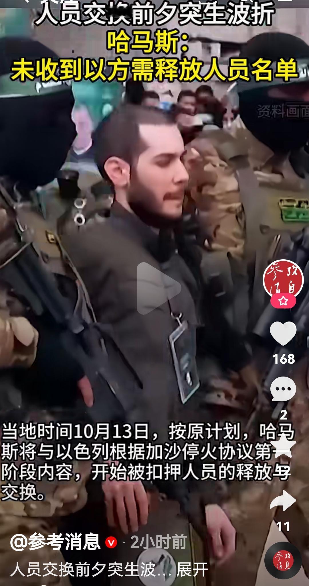 哈马斯和以色列人质交换发生意外 根据媒体报道,根据加沙停火协议第一阶段,哈马斯和以色列就将双方所扣押人员进行交换和释放,但是在交换前夕 哈马斯对外说明,哈马斯仍未收到以色列释放人员的全部名单,原本计划好的以色列和哈马斯人员交换又出现了新的情况 看来以色列不死心啊,特朗普派军人去监督不知道是真还是假,不在趁火打劫了才搞笑呢以军加沙行动 以军集结加沙 美国施压哈马斯 巴勒斯坦沙 图片来自参考消息视频