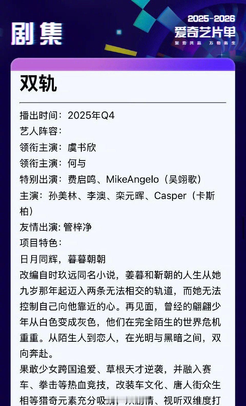 网传虞书欣、何与《双轨》暂定11月20日爱奇艺播出