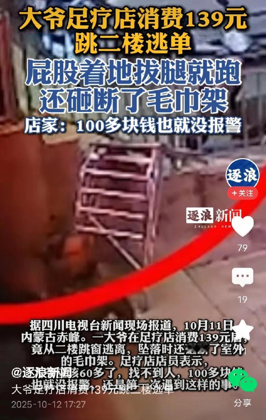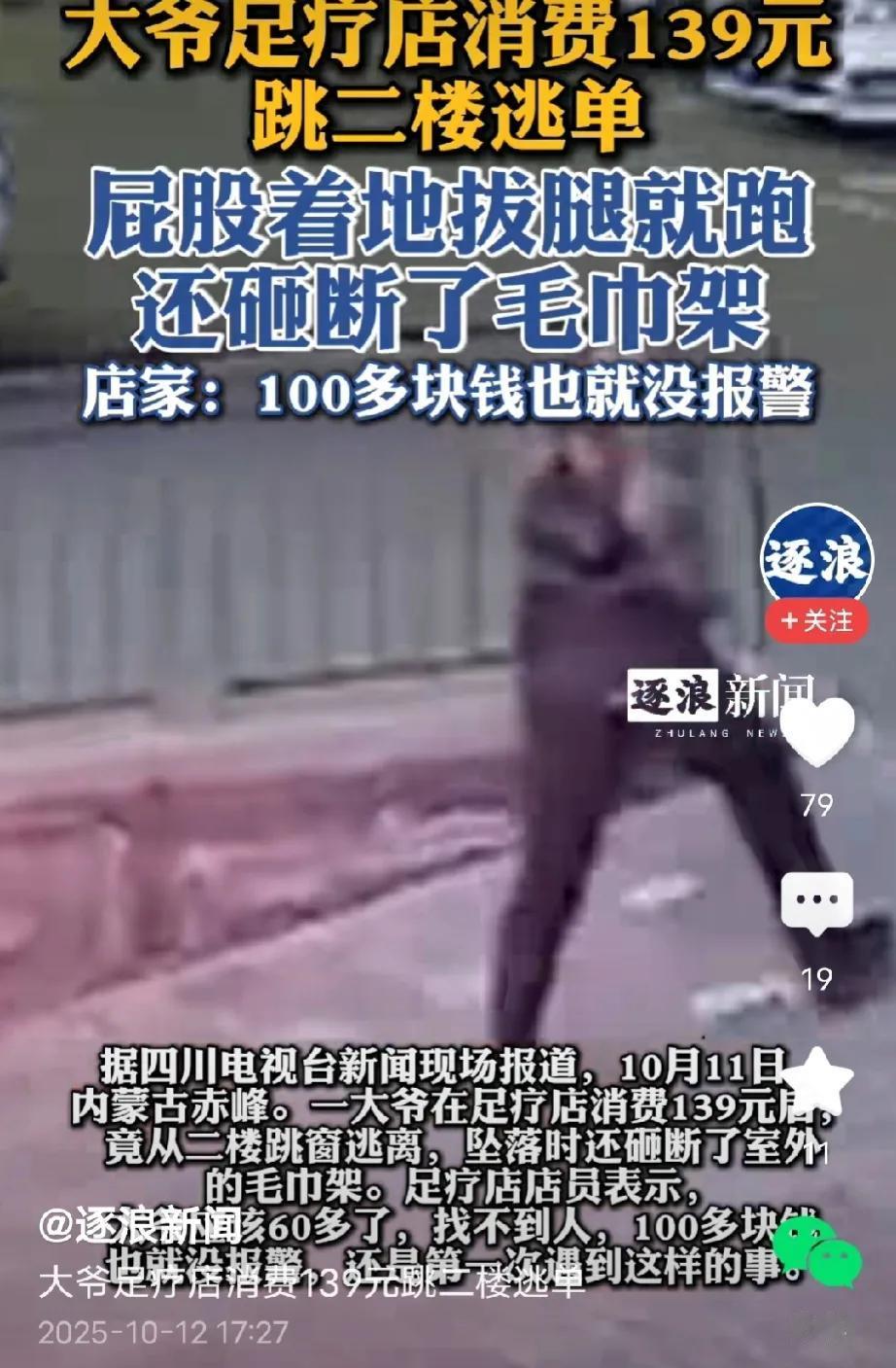 内蒙古赤峰,60岁大爷去足疗店按摩,想放松身心,缓解疲惫,但又舍不得钱,于是他想到了一个馊主意,他选择一家低楼层有大窗户的足疗店,等人家给他按摩完,趁店员不注意,直接从窗户一跃而下逃单,虽然他摔了一屁股,但是,他没白摔,人可以享受了,还省下139元,大爷爬起来后,高兴得撒腿就跑,店员返回屋里,大爷已经不知去向,她查看监控后,哭笑不得。 内蒙古赤峰,一店家在网上发出一段监控视频,视频里一位大爷从他们店里二楼一跃而下后,摔了一跤,但他起身后,撒腿就跑。 原来,事情的经过是这样的,10月11日晚上,7点多左右,他们店里来了一位60多岁的大爷。 大爷告诉店员,他最近身体乏力,总觉得疲惫,想到店里做个足疗或者按摩、泡泡脚之类的,放松心情,缓解一下压力。 大爷看起来穿着朴素,不像是常来这种地方的,不过,来者是客,店员不仅热情招呼大爷,还耐心地给大爷介绍项目。 大爷一边听,一边环顾四周,他穿着工装迷彩服,腰背上系着一个钱包,里面应该是装有钱和手机之类的东西。 最终,他跟着店员进了包间,他说,他就要最普通的消费,放松放松,别整太贵。 店员瞬间明白了大爷的意思,把大爷领进包间后,就给大爷安排了一名专业的服务生,服务员把泡脚水端来后,给大爷一阵忙乎。 大爷躺在足疗沙发上,一副很享受的样子,大概40分钟左右,服务员告诉大爷可以了。 但,大爷没有起身,继续躺在沙发上,闭着眼,舒舒服服地享受着。 服务员看大爷睡得安详,不忍叫醒他,就起身先出去了,打算让大爷先休息一会儿。 可让服务生没想到的是,十多二十分钟后,当她再次回到包间,发现大爷已经不知去向,她赶紧转身去问前台。 前台告诉她,并没有看到大爷离开,也没见他来结账。 服务生又回店里包间等了等,发现大爷还是没回来。 等了许久,服务员把这事告诉主管,主管推断,大爷可能已经悄悄离开了,两人赶紧查看店里监控。 于是,就出现了开头那一幕,大爷趁服务生离开包间的间隙,他赶紧起身,来到包间窗户,他看了看窗外没人,立马爬到窗台上,起身一跃而下。 大爷跳下窗户的时候,因为站不稳摔了一屁股,甚至把窗台下的毛巾架砸成了两段。 大爷摔了之后,顾不及身上的疼痛,奋力怕起身后,就往前冲。 店家看了真是好气又好笑,大爷一共只消费139元,但,为了省下这139元,他可真够拼的,从二楼直接往下跳,也不怕把自己摔伤了。 不过,店家表示,因为金额比较低,她不打算报警,也不追究大爷的责任。 有人说,如果大爷跳下去后,把自己摔手脚骨折了,或者脑袋破洞了,店家需不需要负责? 根据《民法典》第1198条规定,宾馆、商场、银行、车站、体育场馆、娱乐场所等经营场所、公共场所的经营者、管理者或者群众性活动的组织者,未尽到安全保障义务,造成他人损害的,应当承担侵权责任。 因第三人的行为造成他人损害的,由第三人承担侵权责任。 在本案中,大爷是为了逃单而自行从二楼窗户跳下,其受伤是由于自己的故意行为导致,并非因为店家未履行安全保障义务造成。 足疗店作为经营者,在大爷消费过程中,并未出现未设置明显安全警示、未提供安全服务环境或设施等未履行安全保障义务的情况 。 因此,根据上述法律规定,店家不需要承担主要责任,责任应由大爷自行承担 。 不过,如果店家发现大爷受伤后,未及时采取合理的救助措施,如拨打急救电话等,可能需要根据《民法典》第1198条中关于经营者、管理者或者组织者未尽到安全保障义务,承担相应补充责任的规定,承担一定的补充责任。 那么,大爷逃单需要负什么样的法律责任?  大爷逃单的行为可能涉及民事责任和行政责任。 大爷在足疗店接受了按摩服务,与店家形成了服务合同关系。 根据《民法典》第577条规定,当事人一方不履行合同义务或者履行合同义务不符合约定的,应当承担继续履行、采取补救措施或者赔偿损失等违约责任。 大爷逃单的行为属于未履行支付服务费用的合同义务,应当承担支付139元按摩费用的民事责任。 另外,根据《治安管理处罚法》第49条规定,盗窃、诈骗、哄抢、抢夺、敲诈勒索或者故意损毁公私财物的,处五日以上十日以下拘留,可以并处五百元以下罚款。 情节较重的,处十日以上十五日以下拘留,可以并处一千元以下罚款 。 大爷为了逃避支付139元的按摩费用,采取从二楼窗户跳下的方式逃单,其行为可能被认定为故意逃避支付费用,属于行政违法行为。 但由于其逃单金额较低,且未造成其他严重后果,一般情况下可能会根据具体情节给予相应的治安处罚,如警告、罚款等。 写在最后:大爷为了省下139元,冒险从二楼跳窗逃单,实在得不偿失。 这种行为既不道德,又极不安全,万一摔伤不仅要花医药费,还会惹来麻烦。 消费付款是基本准则,再节俭也该守住底线,用危险方式逃单,最终可能得不偿失。 对此,大家赞同吗? @猫眼学法