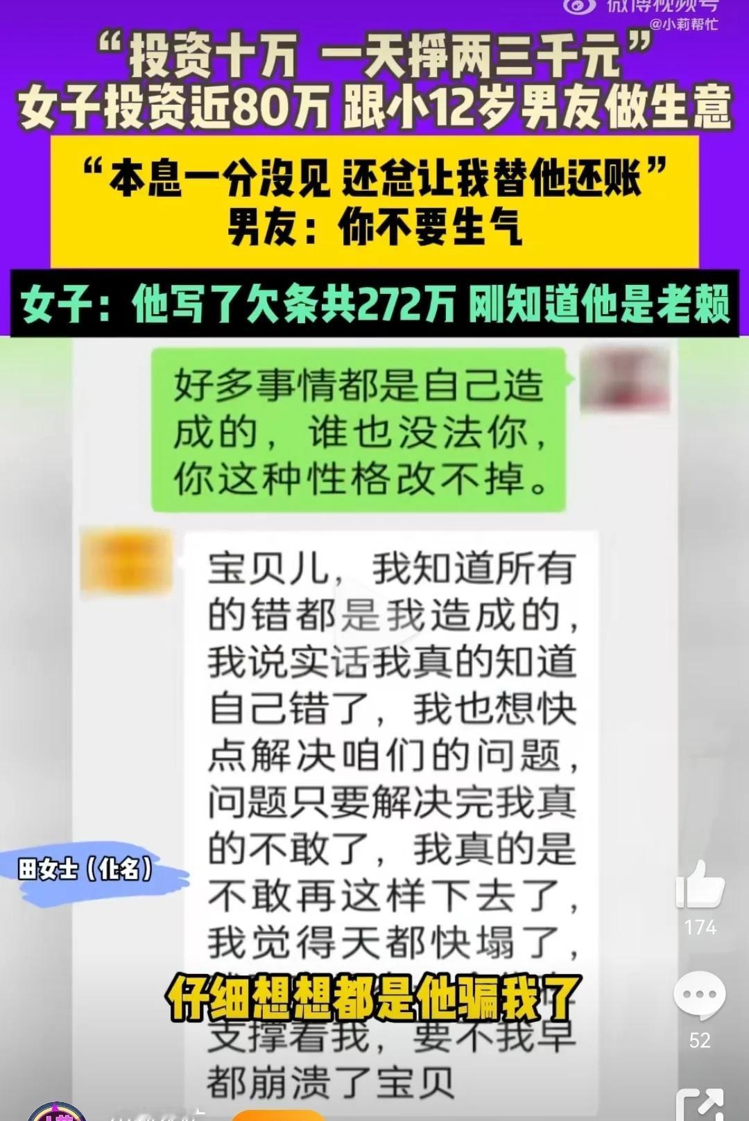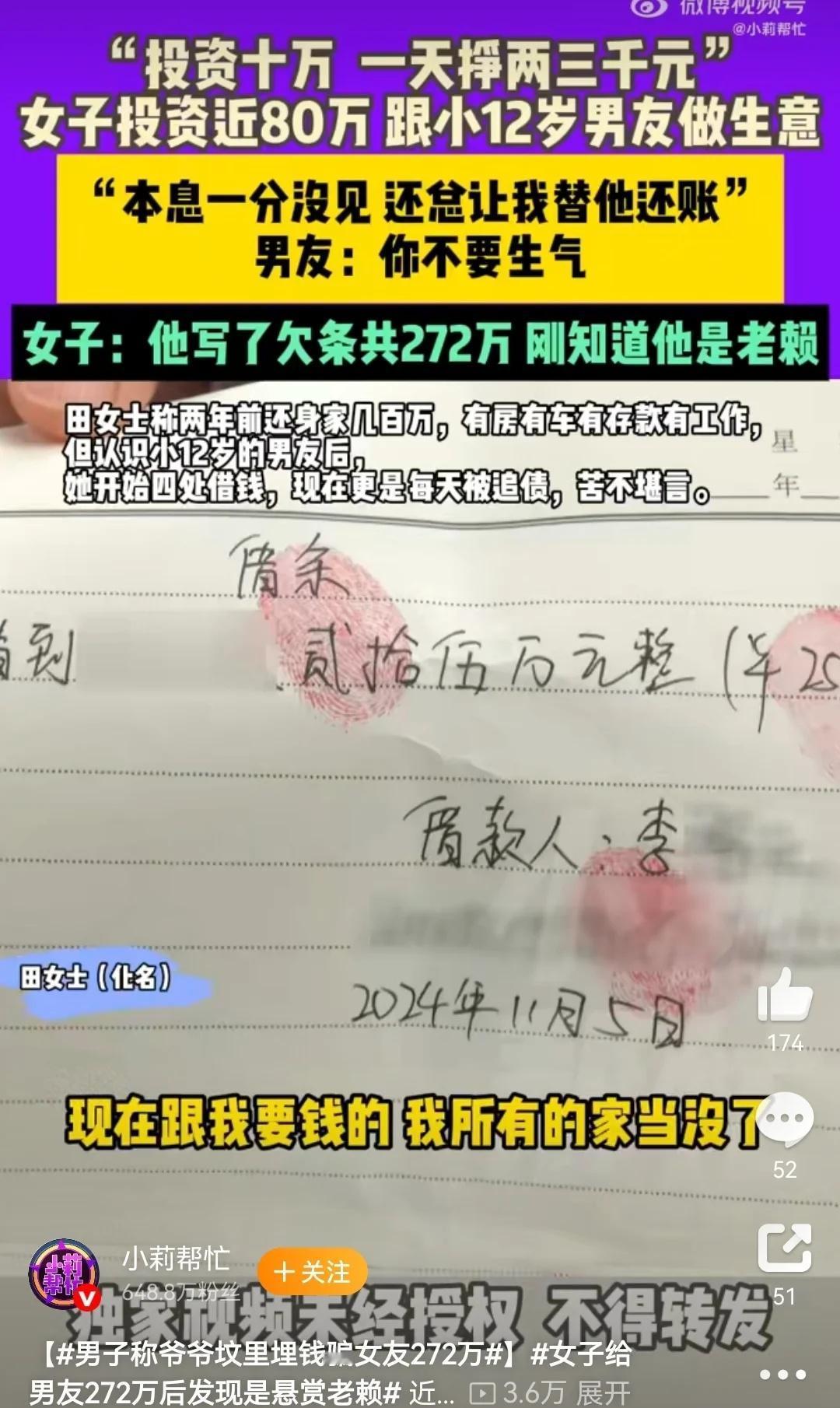 杀猪盘:男子称爷爷坟里埋钱骗女友272万! 近日,河南巩义,田女士(化名)反映她名下2套房1台车, 从事天然气生意,离异后认识一个男友,对方1988年比自己小12岁,就是这段爱情,让她穷的身无分文! “跟着他网络投资,他说被人诈骗让我捞他,”就这样卖房卖车先后拿出272万帮男友“解围”,“他带着我去他爷爷坟头,说地下埋了200万,时间到了就取了还我...”可钱给了男友,对方就消失了..报警后发现男友竟是法院悬赏老赖。 真实案件 社会热点 遵纪守法才是正道 老赖无处可逃 纪实故事 普法宣传 案件 杀猪盘 杀猪盘恋爱