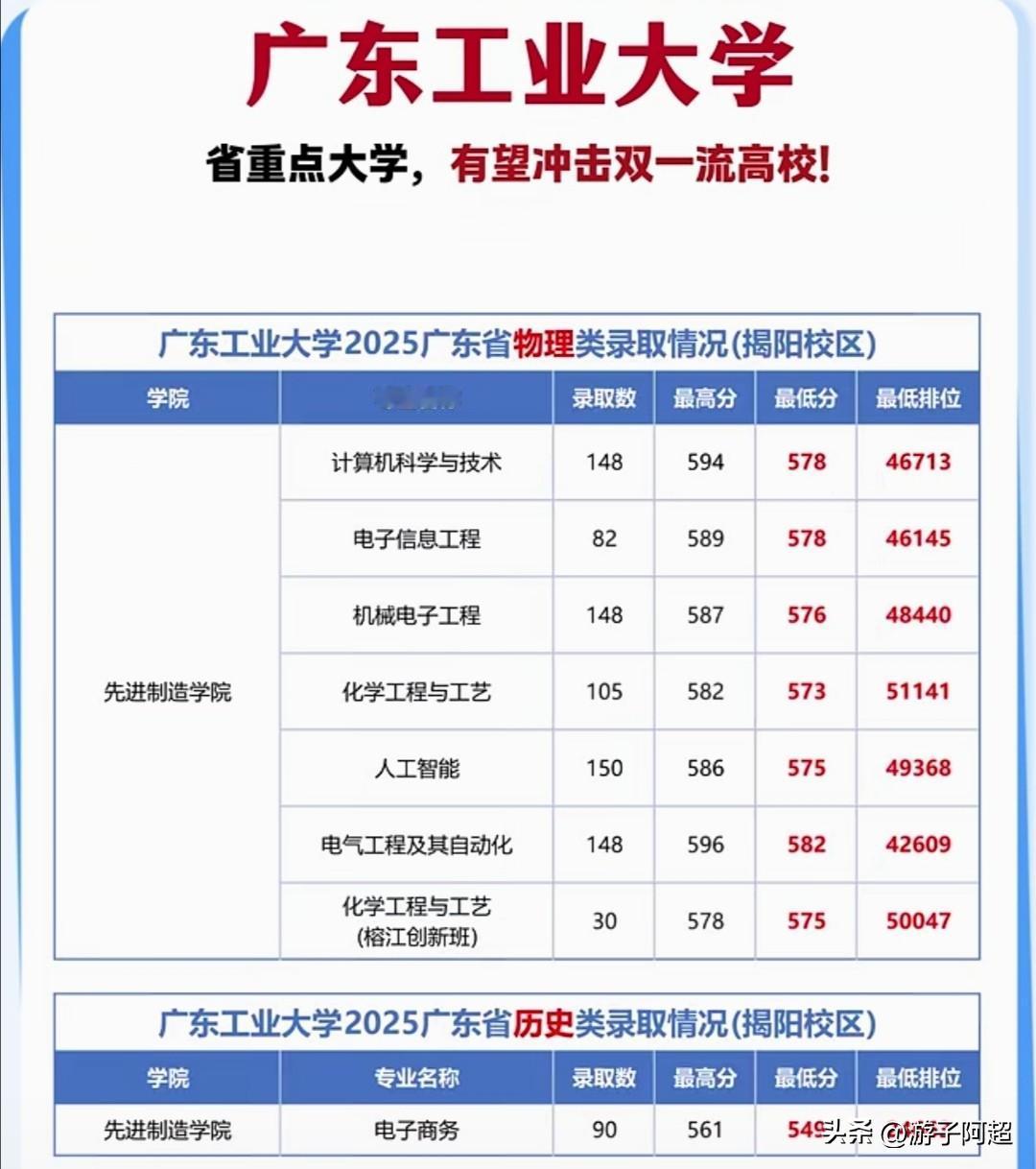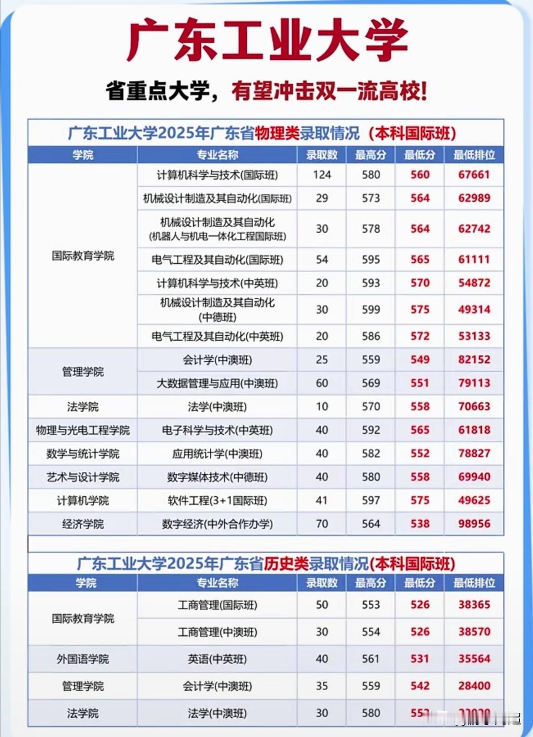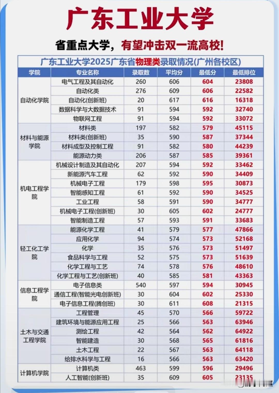 2025年广东工业大学于广东省各专业的录取分数线情况。 广东工业大学虽为双非院校